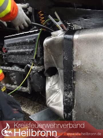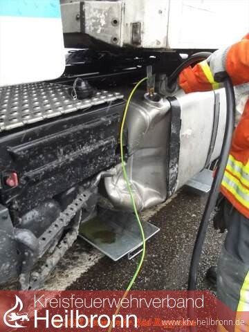 An fast der gleichen Stelle wie am Montagabend war ein PKW aus unbekannter Ursache ins Schleudern geraten und mit einem LKW kollidiert; wiederum wurde der Fahrzeugtank des Lastwagens beschädigt und Diesel lief aus.