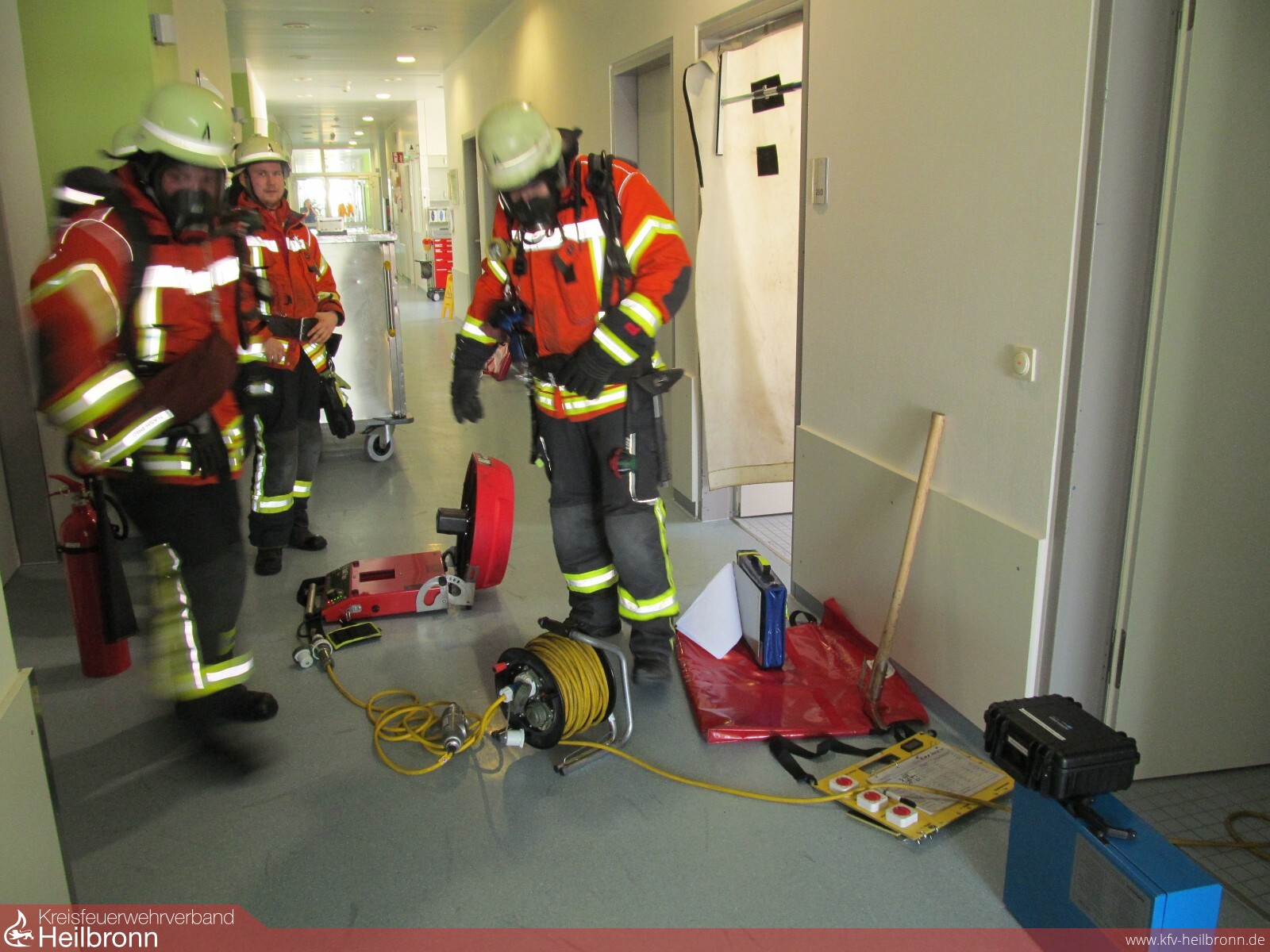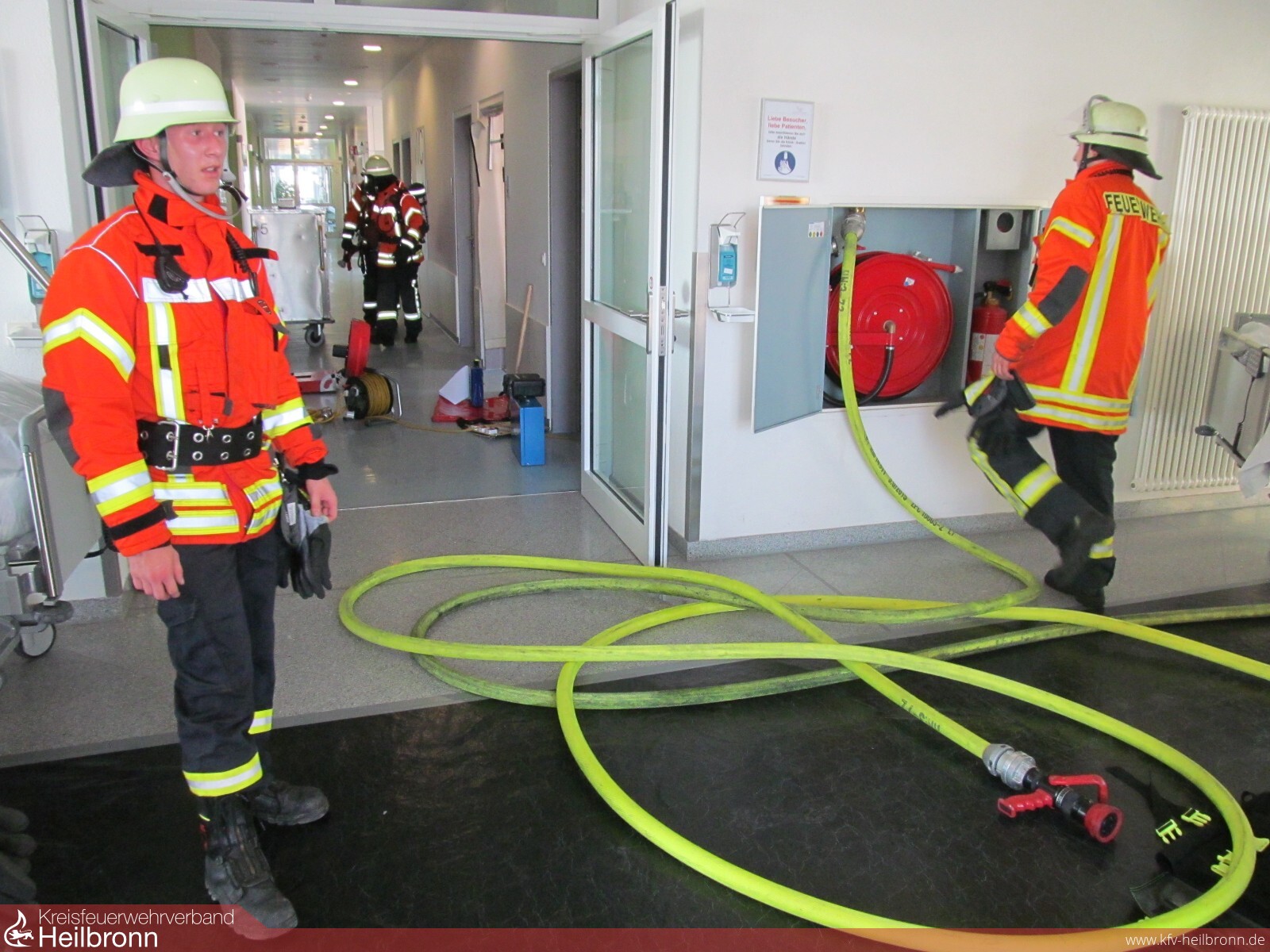 Bei der Erkundung des eingelaufenen Melders konnte eine Verrauchung in einem Raum für Speisen und Getränke in einer Station im 2. Obergeschoss ausgemacht werden. Sicherheitshalber wurden auf Anweisung der Feuerwehr, die Patienten im angrenzenden Bereich in den benachbarten Brandabschnitt verlegt. Daraufhin ging sofort ein Trupp unter Pressluftatmer vor, um eine mögliche Brandstelle zu lokalisieren. Dabei wurde auch ein Wandhydrant vorbereitet. Ursächlich für den Rauch war ein Schmorbrand an einem elektrischen Gerät für Warmhaltebehälter. Das Gerät wurde sofort abgeschaltet und die Räumlichkeiten belüftet.