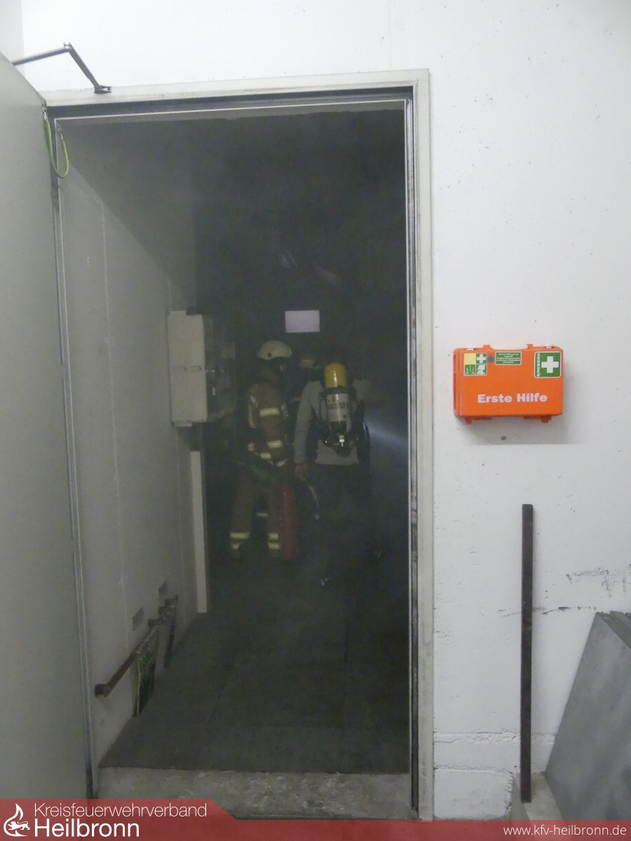 Bei der Erkundung stellten die Einsatzkräfte einen Rauchaustritt aus einem Technikraum im Gebäudes fest.