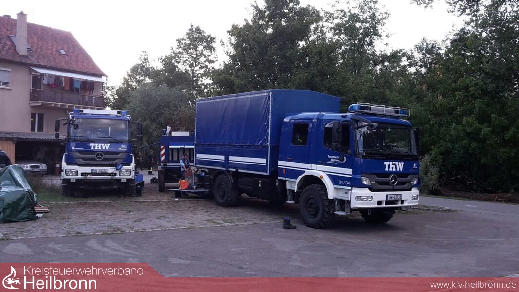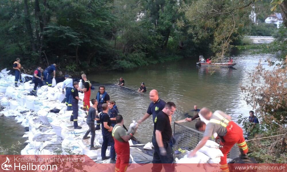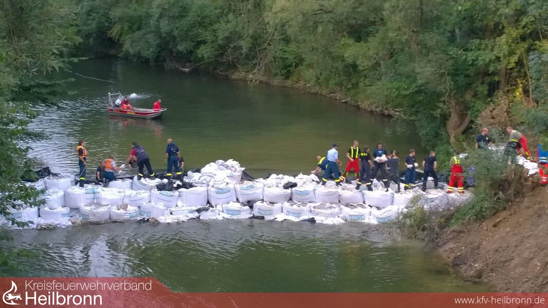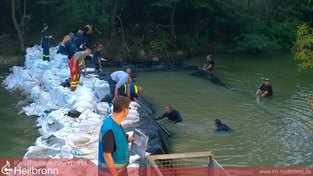 Am Nachmittag ging die Meldung ein, dass das THW Ellwangen auf der Anfahrt sei, um den am Samstag errichteten Damm abzudichten. Ab 17 Uhr liefen diese Maßnahmen mit personeller Unterstützung durch Fischer, Feuerwehr und Bevölkerung an. Zusätzlich wurden Kräfte des DLRG alarmeirt, um die Arbeiten am Wasser abzusichern. Bis etwa 23 Uhr gelang es den Frauen und Männern, den Damm abzudichten. Eine große Unterstützung hierbei war der „Abrollbehälter Sandsack“ der Berufsfeuerwehr Heilbronn. Mit diesem, und ebenfalls starker Manpower konnten in kurzer Zeit etwa 2000 Sandsäcke befüllt werden.