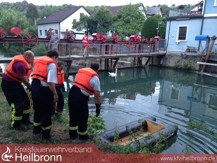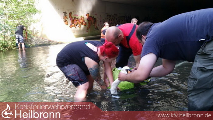 Zu einem zweiten Versuch um den verletzten Schwan einzufangen rückte die Abteilung Möckmühl mit neuer Taktik nochmals an die Seckach aus.