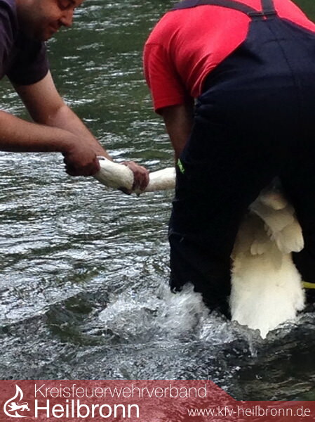 Zu einer Tiernotlage wurde die Abteilung Möckmühl an die Seckach gerufen, dort wurde ein Schwan mit einer Angelschnur im Schnabel entdeckt.