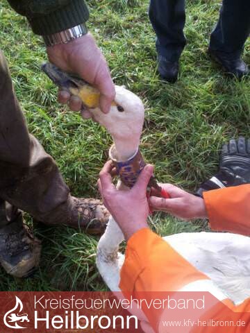 Einen verletzten Schwan meldete ein Verkehrsteilnehmer am Nachmittag des vergangenen Samstags auf einem Acker unter der Autobahnbrücke bei Hardthausen-Gochsen. Wie die eingesetzten Polizeibeamten und die Einsatzkräfte der hinzugezogenen Freiwilligen Feuerwehr Hardthausen feststellten, hatte das gepeinigte Tier eine Plastikröhre um den Hals. Es scheint unmöglich, dass der Schwan sich die festgeklebte Röhre selbst über den Kopf gestülpt hatte (siehe Fotos der FFW Hardthausen-Gochsen). Mit einem Seitenschneider konnten Abteilungskommandant Thomas Engler und seine Einsatzkräfte das Tier von der Röhre befreien, den angesammelten Dreck von seinem Hals waschen und ihn im Naturschutzgebiet am alten Kocher wieder aussetzen. Die Polizei hofft, dass jemand beobachtet hat, als sich der Tierquäler mit dem Schwan beschäftigte, der Beobachter sich aber zu dem Zeitpunkt im Unklaren über die Absicht des Unbekannten war. Hinweise gehen an das Polizeirevier Neckarsulm, Telefon 07132 93710.