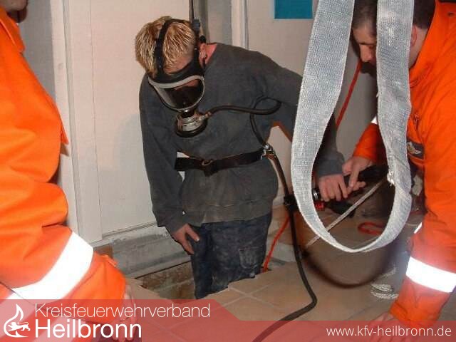 Unter Atemschutz musste ein Kamerad in die Öffnung einsteigen und nach der Ursache suchen. Dies war mit einem normalen Atemschutzgerät nicht möglich, da man nicht durch die Öffnung gepasst hätte. Also wurde aus Neckarsulm eine Verlängerung für den Lungenautomaten gebracht, um so den Kameraden mit Frischluft zu versorgen.