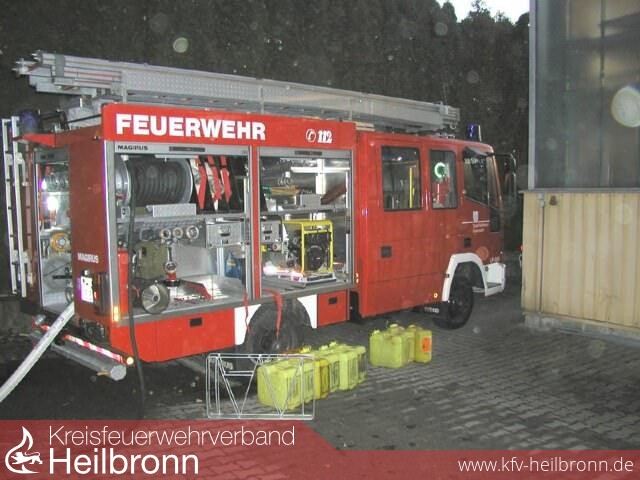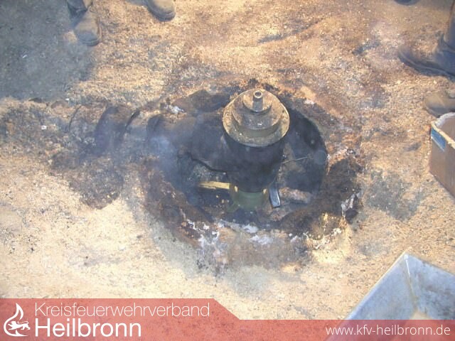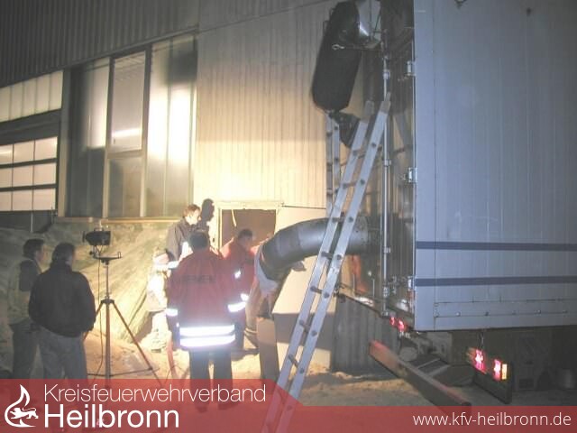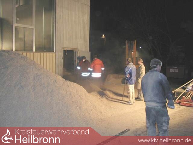 Bei einem Kontrollgang während der Betriebsferien einer Heilbronn Firma, stellte ein Mitarbeiter Rauchgeruch im Bereich der Heizanlage fest. Hierbei handelte es sich um eine Feuerstätte, welche über eine Förderschnecke mit Holzspänen aus einem Silo gespeist wird. Unter Einsatz von Wärmebildkamera und Fernthermometer wurde der Förderbereich an der Unterseite des Betonsilos kontrolliert. Die Bodenplatte des Silos hatte sich bereits merklich erwärmt. Mit dem Fernthermometer konnte durch eine kleine Wartungsklappe eine Innenraumtemperatur von 80°C gemessen werden. Über diese kleine Öffnung wurde eine geringe Menge Wasser-Netzmittelgemisch abgegeben. Gleichzeitig kontrollierte ein Trupp den Füllstand des Silos. Nachdem eine Seitentür am Silo geöffnet war, begannen die Kollegen der Abteilung Biberach mit dem Ausräumen des Silos. Parallel hierzu forderte man ein Spezialfahrzeug zum Absaugen der Späne an. Im Bereich des Fördermechanismusses waren größere Mengen an verkohlten und zum Teil noch glühenden Spänen zu erkennen. Der Auslöser des Schwelbrandes war vermutlich ein heißgelaufenes Wellenlager an der Förderschnecke.