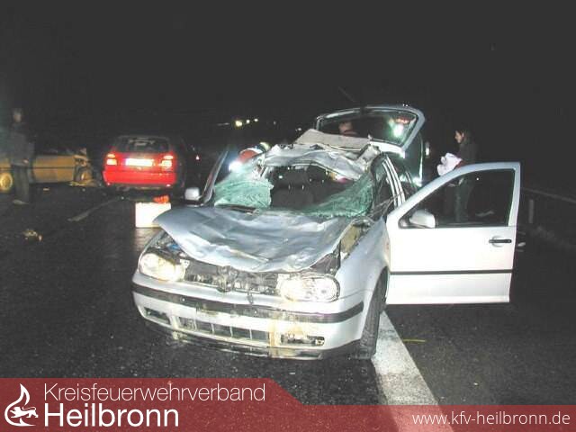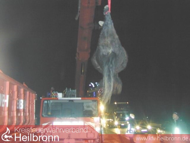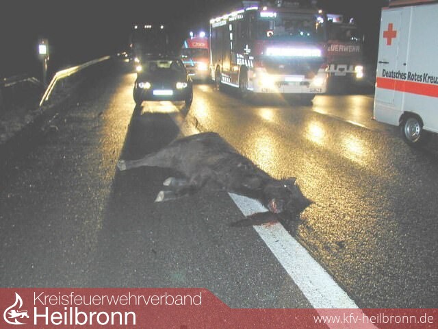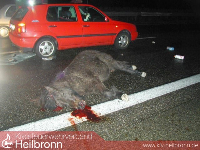 Zum Teil schwere Verletzungen zogen sich sechs Verkehrsteilnehmer am frühen Sonntagmorgen auf der A 6 in Fahrtrichtung Mannheim zu. Auslöser der Unfälle waren zwei freilaufende Pferde, welche aus noch nicht geklärten Umständen auf die Fahrbahn gelangen konnten. Diese Tiere kamen zwei Personenwagen entgegen, mit denen sie zusammenprallten. Beide Tiere waren durch den harten Aufprall der Fahrzeuge vermutlich sofort tot. Ein nachfolgender Pkw konnte nicht mehr halten und fuhr in die Einsatzstelle.