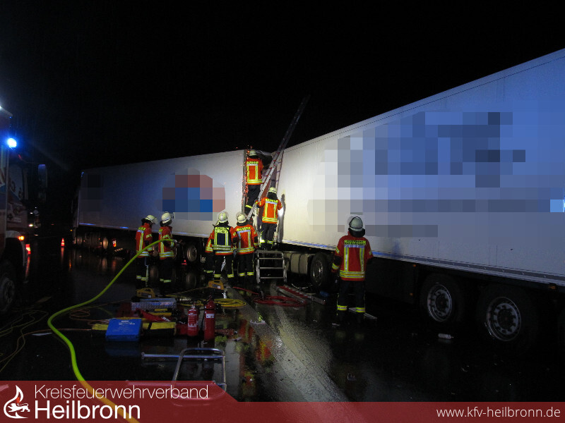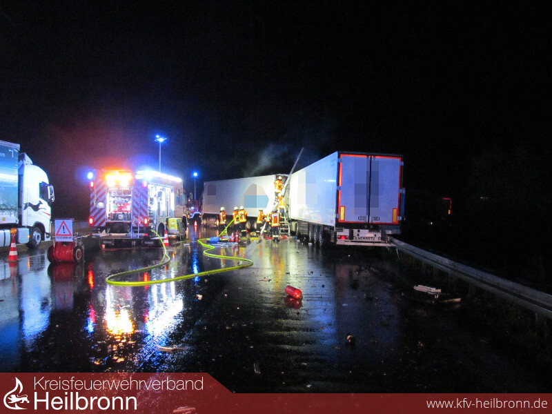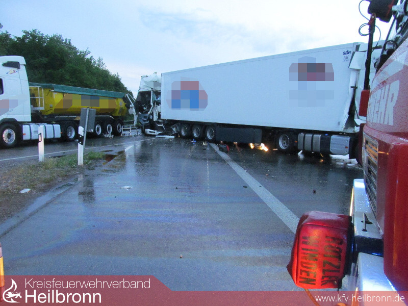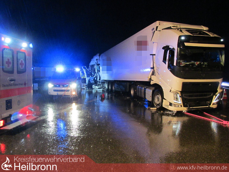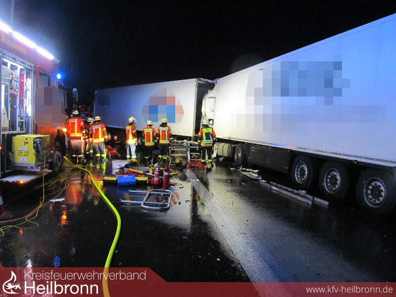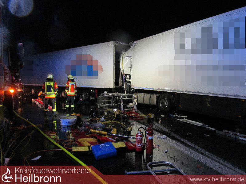 Mit dem Alarmstichwort „Verkehrsunfall LKW“ wurde die Abteilung Bad Rappenau am frühen Dienstagmorgen gegen 4 Uhr alarmiert. Ein LKW Fahrer war mit seinem Sattelzug in Fahrtrichtung Mannheim unterwegs. Dabei kam er kurz vor dem Parkplatz Bauernwald von der Fahrbahn ab und fuhr auf den rechten Standstreifen. Dort kollidierte er ungebremst mit einem geparkten Sattelzug. Hierbei wurde der Fahrer des Auffahrenden LKWs eingeklemmt. Die Freiwillige Feuerwehr befreite den Fahrer aus seinem Fahrzeugwrack mit hydraulischem Rettungsgerät und unter Absprache des Notarztes vor Ort. Der Fahrer verstarb wenig später im Krankenhaus. Die Feuerwehr sicherte zudem die Einsatzstelle ab und nahm auslaufende Betriebsstoffe auf. Der Fahrer des parkenden LKWs wurde leicht verletzt. Die Bergung der beiden Fahrzeuge übernahm eine Spezialfirma. Die Autobahn war bis 11 Uhr voll gesperrt. Die Berufsfeuerwehr war mit dem Feuerwehrkran, sowie dem Vorausrüstwagen im Einsatz. Die Feuerwehr Bad Rappenau war mit 4 Fahrzeugen und 22 Mann im Einsatz.