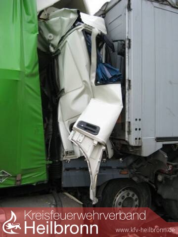 An der Einsatzstelle stellte sich für die Feuerwehr folgende Lage dar: Ein Lkw war mit großer Wucht auf seinen Vordermann aufgefahren. Durch die Wucht des Aufpralls waren die Fahrzeuge ineinander verkeilt und der Fahrer des hinteren Lkw war in seinem Führerhaus eingeklemmt. Aus beiden Lkw lief eine größere Menge Diesel aus.