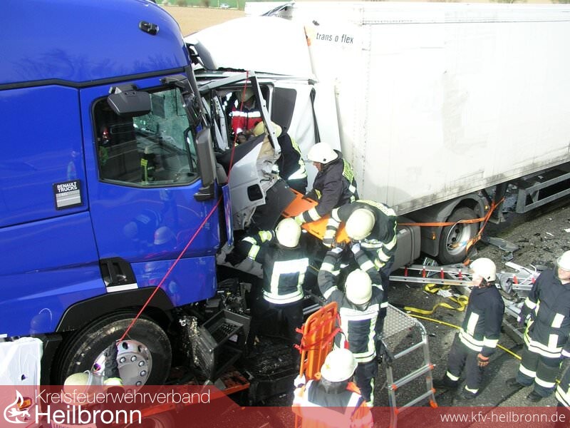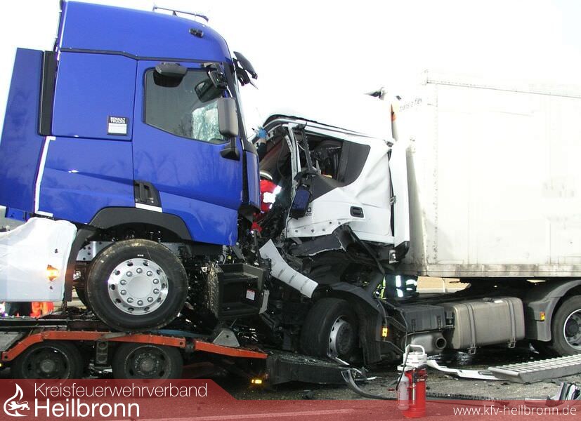 Der Fahrer wurde hierbei schwer verletzt in seiner Fahrerkabine eingeklemmt und musste durch die Feuerwehr befreit werden.