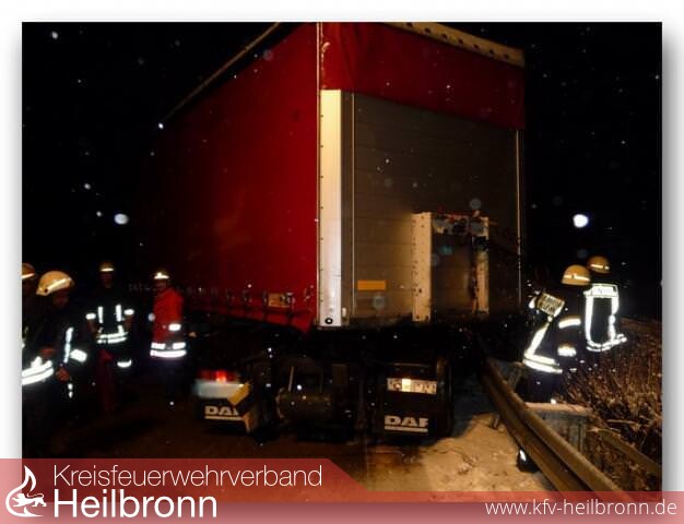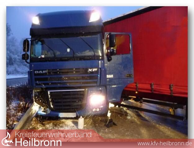 Vermutliche auf Grund von Schneeglätte kam ein Sattelzug ins Schleudern. Das Fahrerhaus verdrehte sich dabei gegen die Fahrtrichtung und der Auflieger drückte die Zugmaschine in die Mittelleitplanke.