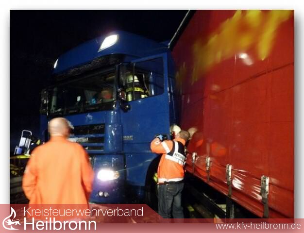 Zu einem Verkehrsunfall mit einem LKW und einer eingeklemmten Person wurden die Feuerwehren aus Widdern und Möckmühl auf die BAB 81 in Fahrtrichtung Würzburg gerufen.