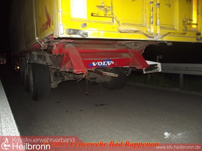 Ca. bei Kilometer 622,5 war ein PKW aus unbekannter Ursache in das Heck eines vorausfahrenden LKW gefahren. Durch den Aufprall wurde der PKW-Lenker in seinem Fahrzeug eingeklemmt und der LKW-Anhänger erheblich beschädigt.