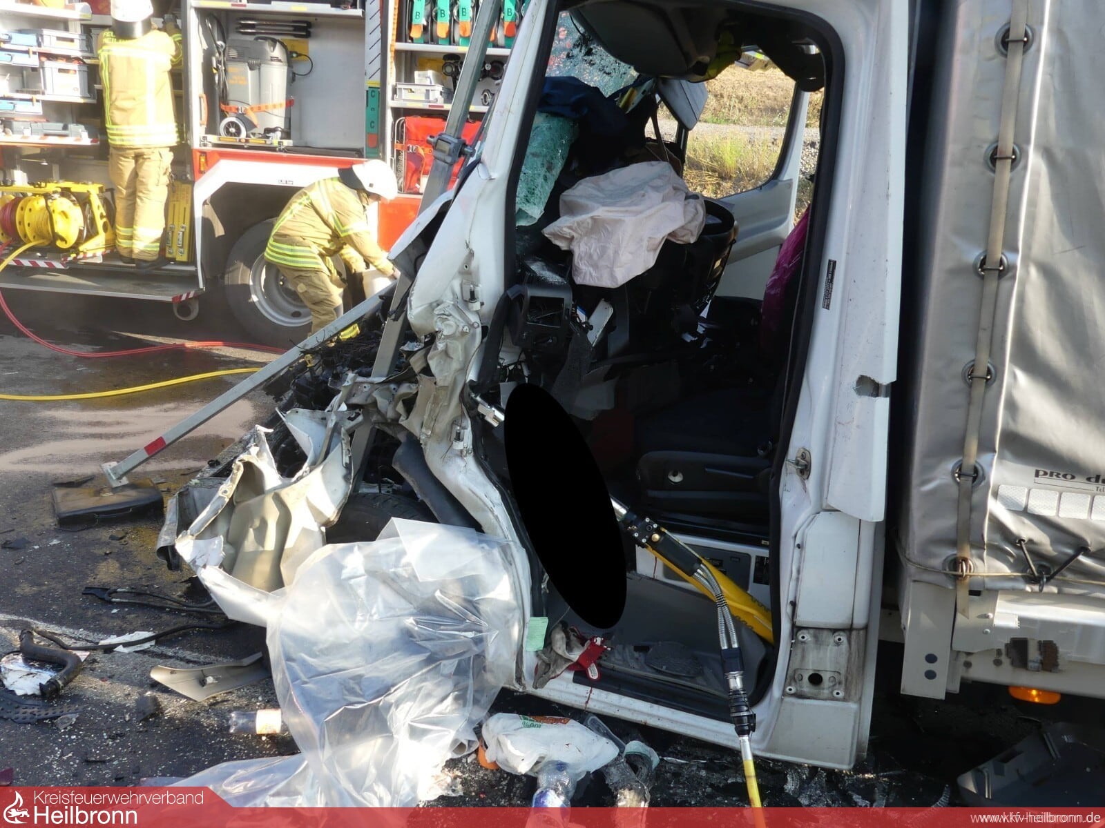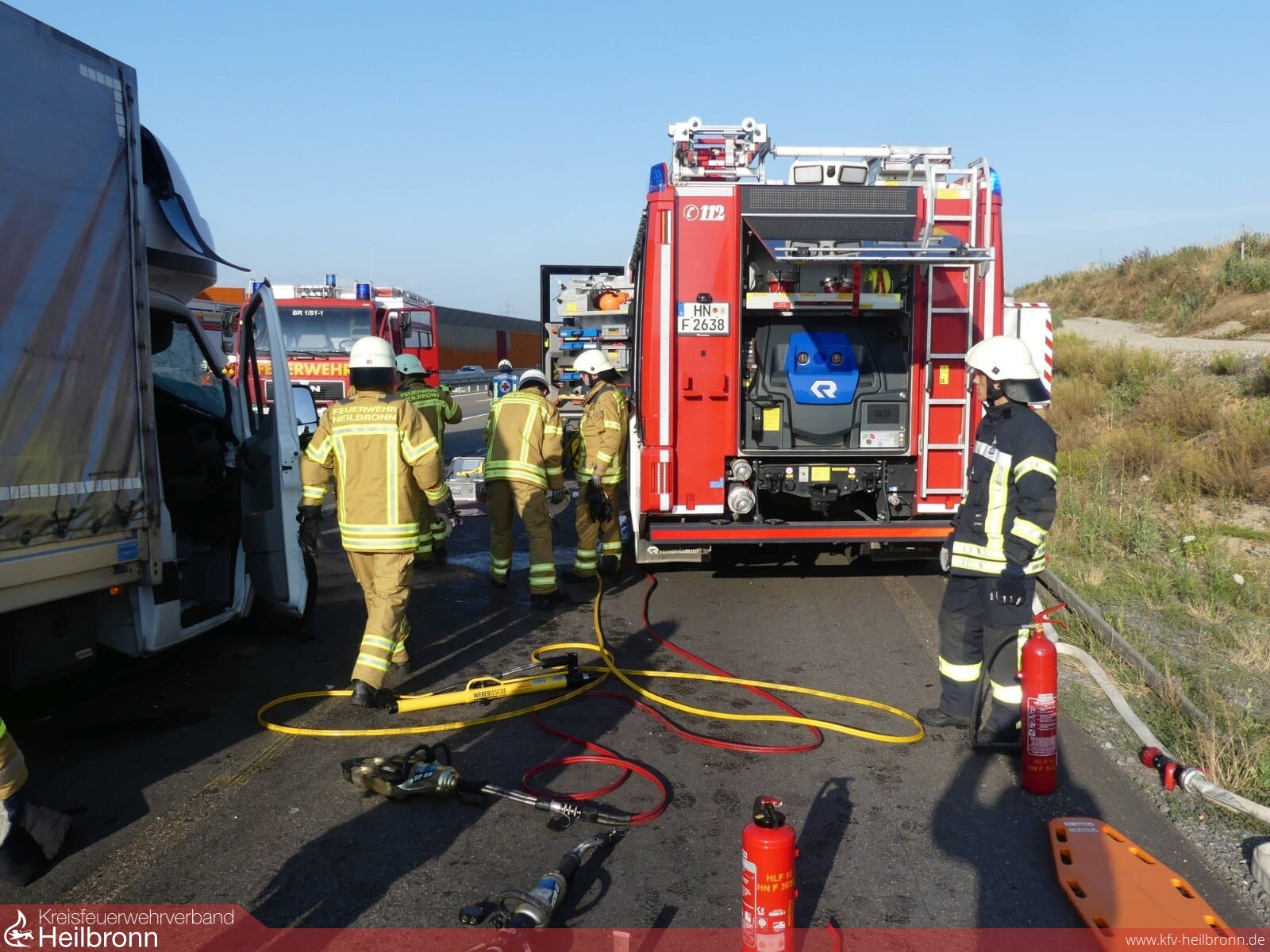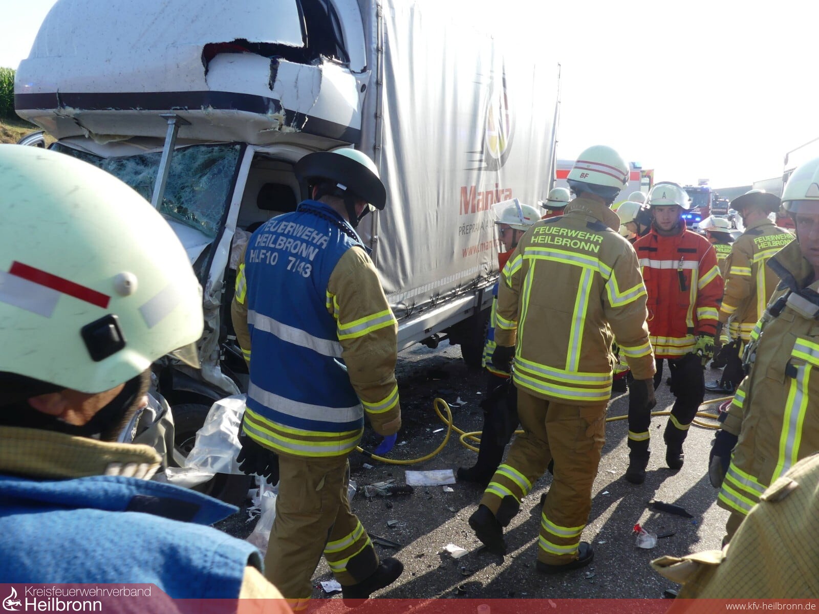 Gegen 18.30 Uhr staute sich der Lkw-Verkehr auf dem rechten Fahrstreifen der A6 in Fahrtrichtung Nürnberg. Ein 55-jähriger Fahrer eines tschechischen Sprinters bemerkte den Stau in Höhe Heilbronn-Biberach offensichtlich zu spät. Trotz Ausweichversuche konnte er den Unfall nicht mehr verhindern und prallte mit großer Wucht gegen die rechte Ecke des vor ihm stehenden Sattelaufliegers. Hierbei wurde die Fahrerkabine des Kleintransporters massiv eingedrückt und der Fahrer schwer verletzt eingeklemmt.Trotz der guten medizinischen Versorgung durch den Rettungsdienst sowie der schnellen Befreiung durch die Berufsfeuerwehr sowie die Freiwilligen Feuerwehren Heilbronn-Kirchhausen, Heilbronn-Biberach und Bad Rappenau verstarb der Mann noch an der Unfallstelle.