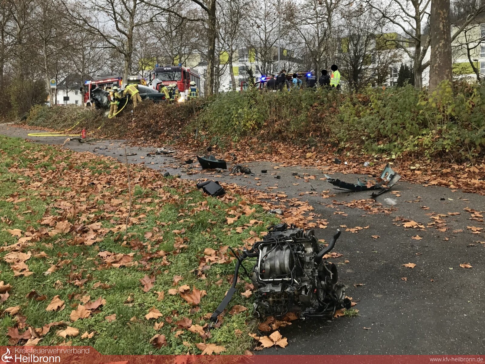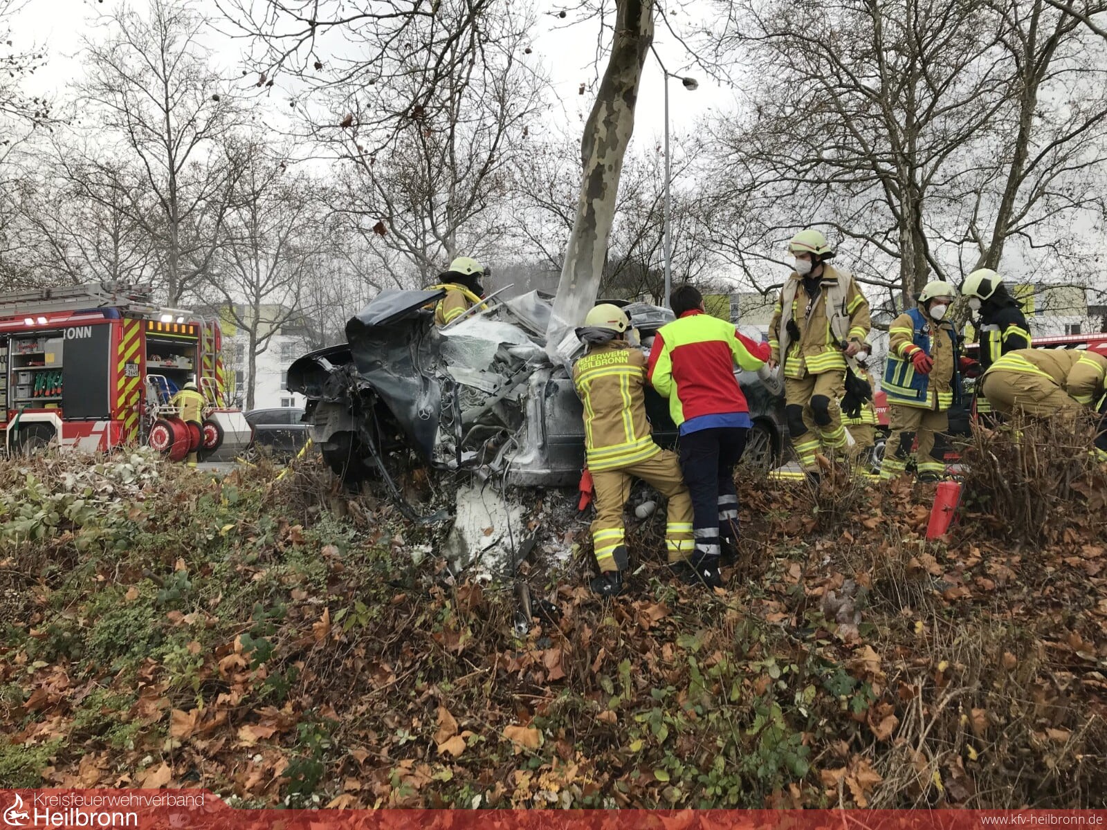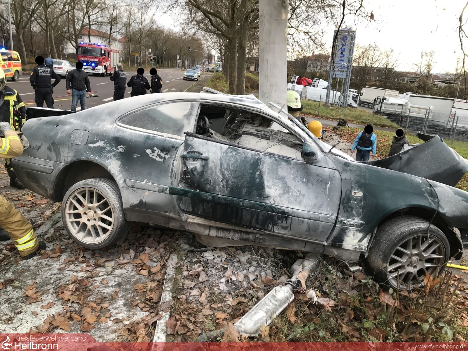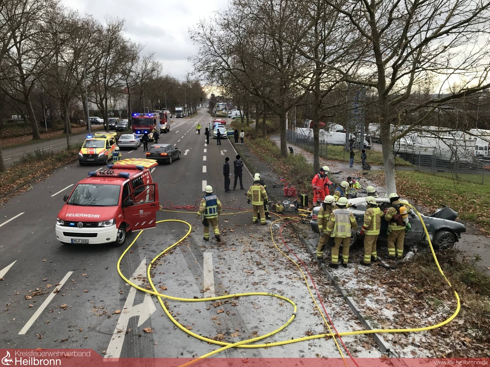 Lebensgefährliche Verletzungen zog sich heute ein Pkw-Fahrer bei einem Unfall auf der B 27 zu. Das Fahrzeug war gegen 13.45 Uhr vermutlich mit überhöhter Geschwindigkeit in Fahrtrichtung Heilbronn unterwegs. Rund 100 Meter vor der Einmündung zur Brüggemannstraße verlor der junge Mann die Kontrolle über seinen Mercedes und krachte frontal gegen einen Baum. Kurz nach dem Aufprall fing der Wagen an zu brennen. Ersteintreffende Polizisten sowie ein Feuerwehrangehöriger, welcher nahe der Unfallstelle wohnt, konnten die Flammen bis zum Eintreffen der Einsatzkräfte mit Pulverlöschern eindämmen. Zur Rettung des Verunfallten mussten mehrere hydraulische Rettungsgeräte eingesetzt werden.