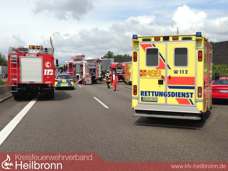 Ein Lebensgefährlich- und ein Schwerverletzter sind die erschreckenden Folgen eines schweren LKW-Unfalls auf der BAB 6 am Dienstagmorgen. Gegen10:30 Uhr befuhr ein 50-Jähriger mit einem mit Silogetreide beladenen LKW samt Anhänger den rechten Fahrtreifen der Autobahn in Richtung Mannheim, als er kurz vor dem Weinsberger Kreuz offenbar zu spät erkannte, dass es vor ihm zu einem Stau gekommen war. Er versuchte noch nach links auszuweichen, was ihm aber nicht gelang. Infolgedessen fuhr der LKW-Lenker leicht überlappend auf das Heck des Sattelaufliegers eines vor ihm verkehrsbedingt wartenden 44-Jährigen auf. Der Getreide-LKW wurde nach links abgewiesen, touchierte den BMW einer 34 Jährigen, die links neben ihm fuhr, kippte um und rutschte bis zur Mittelleitplanke. Der 50-Jährige wurde in seinem Führerhaus eingeklemmt und lebensgefährlich verletzt. Er wurde mit einem Krankenwagen in eine Klinik gebracht. Der Sattelschlepper des 44 Jahre alten Fahrers wurde zunächst auf den Sattelauflieger seines Vordermanns geschoben und anschließend gegen die rechte Leitplanke, wo er zum Stehen kam. Auch dieser Fahrer wurde sehr schwer verletzt und zunächst in seinem Führerhaus eingeklemmt. Nach Bergung wurde er mit einem Rettungshubschrauber in ein Krankenhaus geflogen. Schließlich wurde durch den Anstoß des Sattelschleppers des 44-Jährigen das Fahrzeug von dessen Vordermann auf einen weiteren Sattelzug geschoben. Die beiden vorderen Fahrzeugführer sowie die PKW-Lenkerin blieben glücklicherweise un- bis leichtverletzt. Der Gesamtschaden wird auf zirka 220.000 Euro geschätzt. Zur Bergung und Unfallaufnahme wird die Autobahn A6 in Fahrtrichtung Mannheim ab Höhe des Weinsberger Kreuzes wohl noch für ungefähr vier Stunden (Stand: 14:30 Uhr) voll gesperrt bleiben müssen.