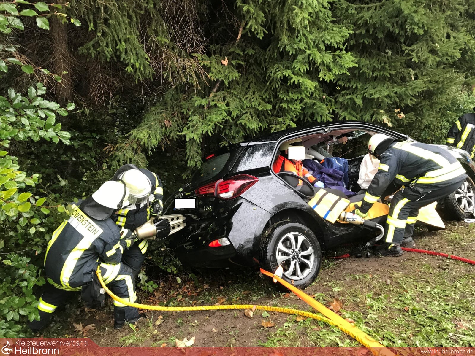 Auf Höhe der Klinik Löwenstein kam es aus unbekannter Ursache zu einem Zusammenstoß von 2 PKWs, in dessen Folge beide Fahrzeuge von der Fahrbahn abkamen und eines davon einen 2m tiefen Abhang hinterstürzte und an einem Baum zum Stehen kam. Der Fahrer wurde in seinem Fahrzeug eingeschlossen.