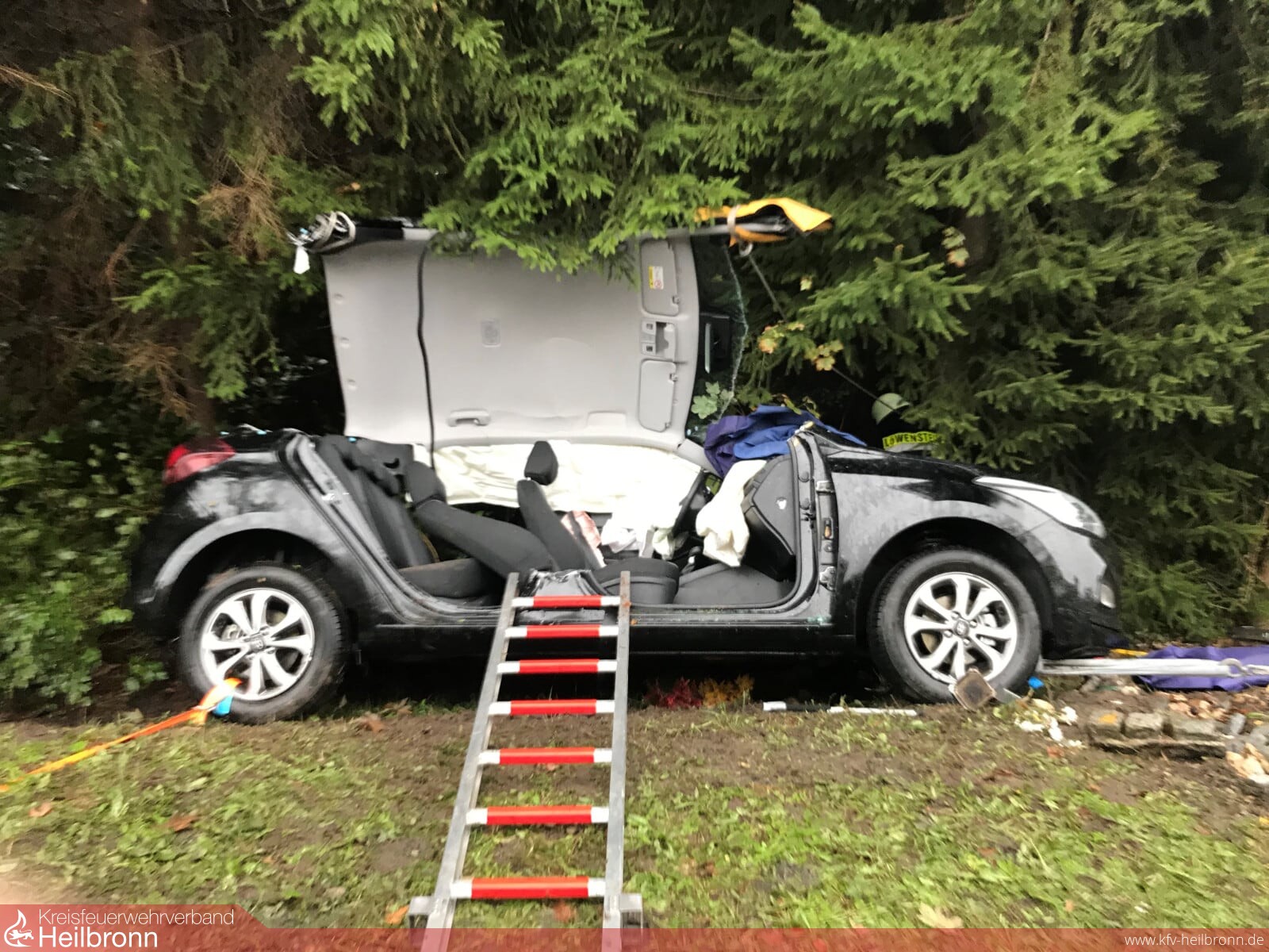 Nach dem Eintreffen an der Einsatzstelle wurde umgehende mit Hilfe des Mehrzweckzuges und unter Einsatz des Stab-Fast Stabilisierungsystems des HLFs der PKW gegen weiteres Abrutschen gesichert und der Brandschutz sichergestellt. Parallel wurde in enger Abstimmung mit dem Rettungsdienst die Technische Rettung vorbereitet. Aufgrund des Verletzungsmusters entschied sich der Notarzt in Absprache mit dem Einsatzleiter der Feuerwehr Löwenstein zu einer Rettung über eine große Seitenöffnung und Abklappen des Daches.