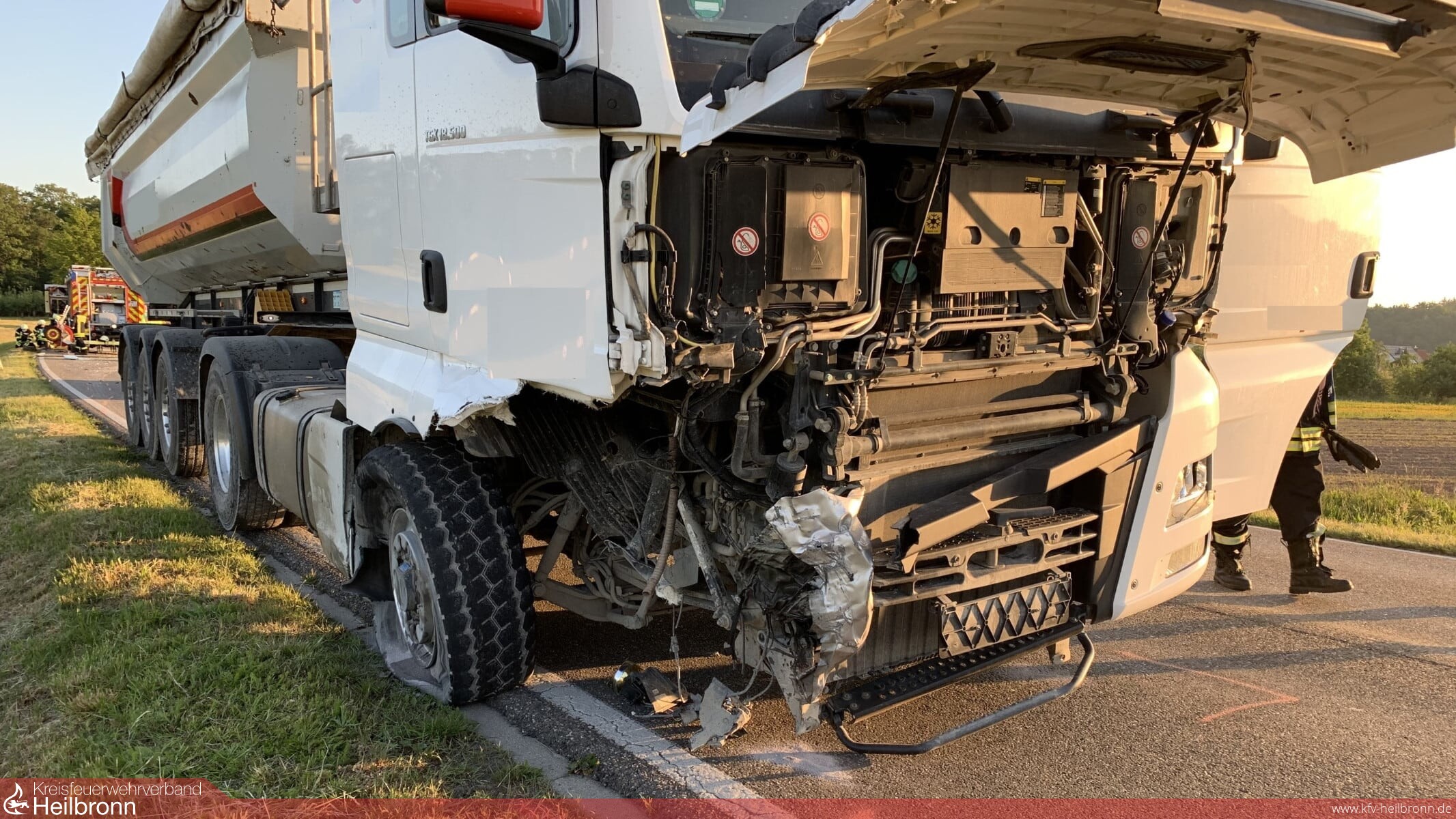 Ein Pkw war aus zunächst ungeklärter Ursache frontal auf einen LKW geprallt und wurde seitlich in einen Acker abgewiesen. Eine Person im PKW wurde durch den Aufprall schwerst verletzt und im PKW eingeklemmt. Ein Entstehungsbrand im Motorbereich konnte glücklicherweise durch Passanten mit einem Feuerlöscher abgelöscht werden. Der Fahrer des LKW blieb unverletzt.