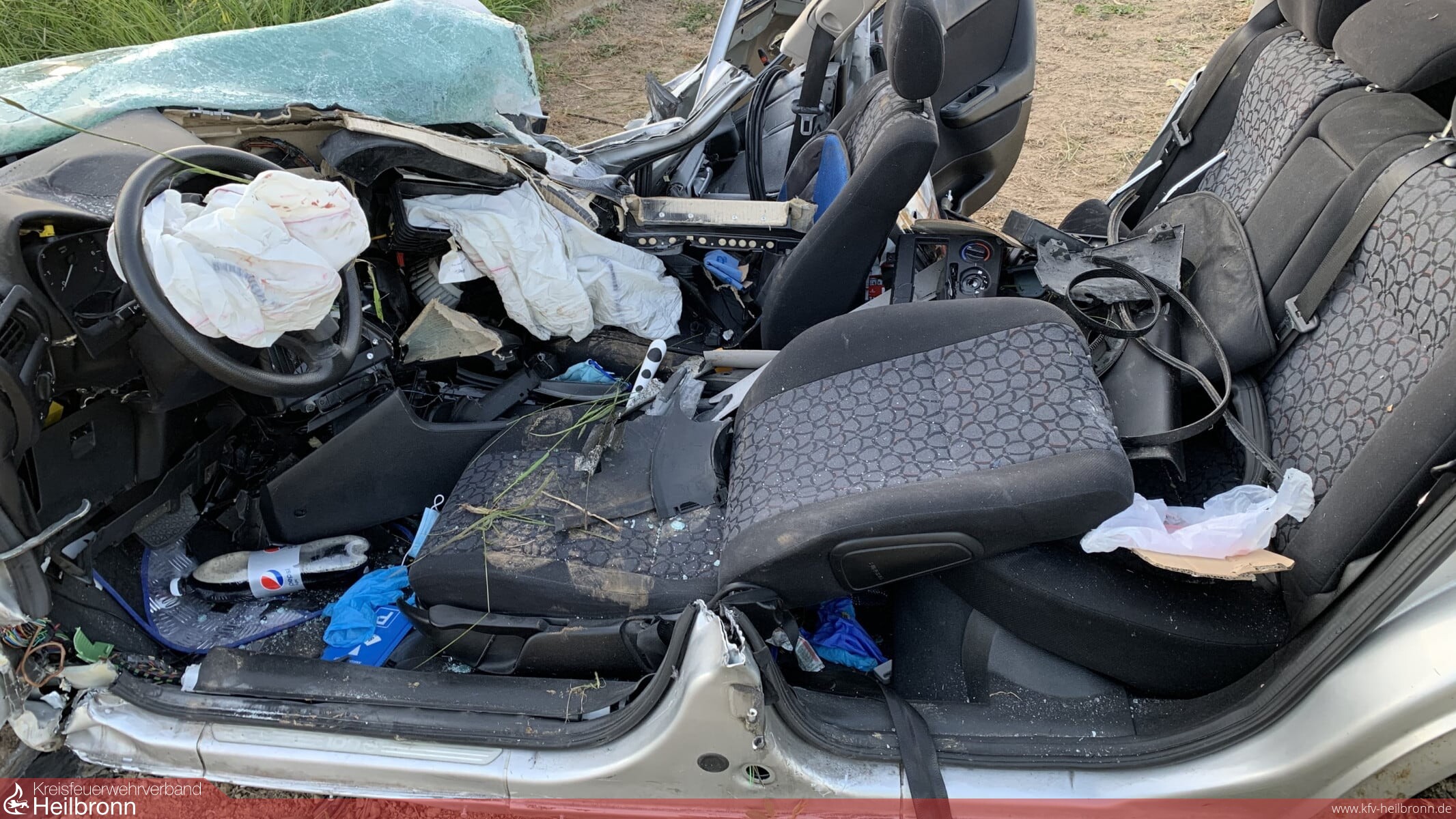 Die Kräfte der Feuerwehren aus Untergruppenbach und Heilbronn befreiten in sehr guter Zusammenarbeit die Person aus dem Fahrzeug. Hier kam neben Spreizern, Scheren und mehreren Rettungszylindern auch ein Kettenzug zum Einsatz.