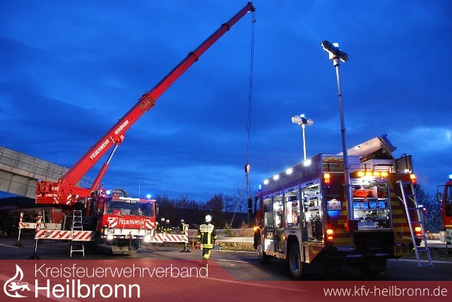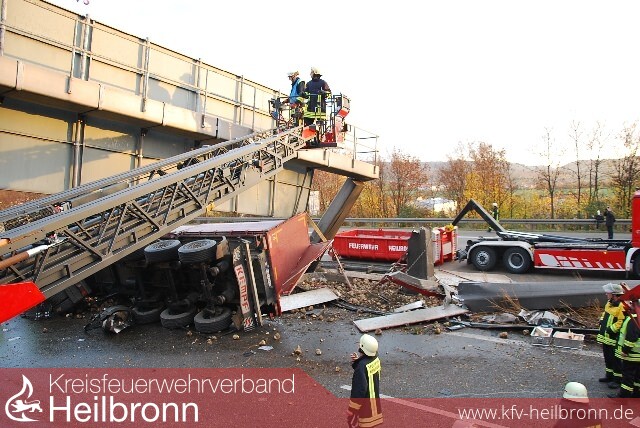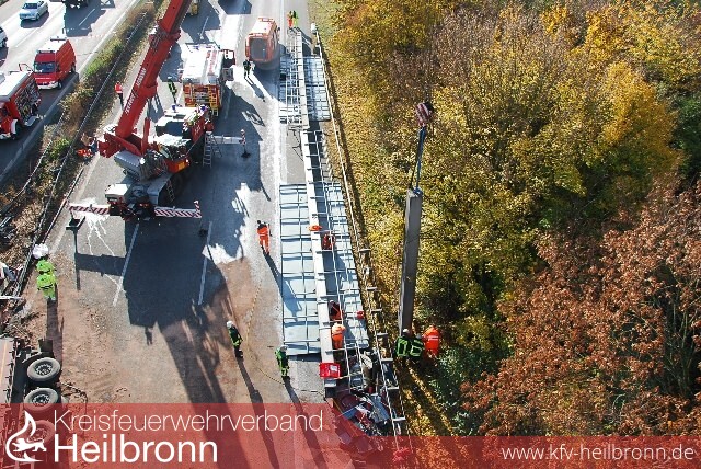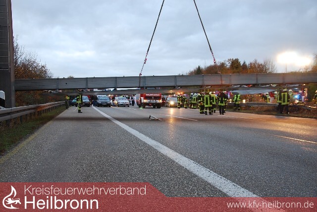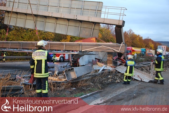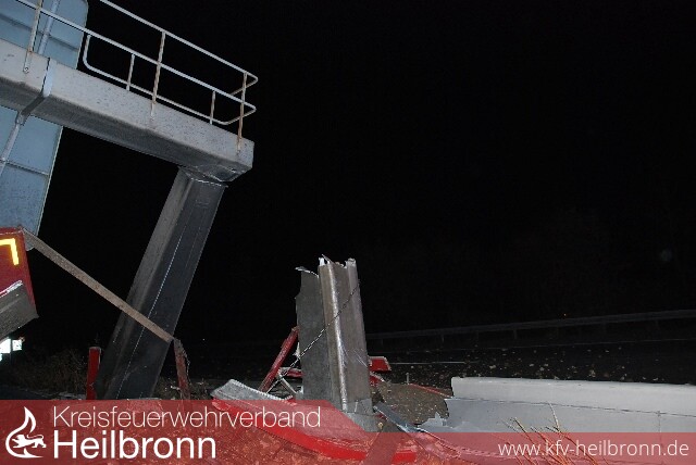 Die Autobahnmeistereien Ludwigsburg und Neuenstadt waren mit 20 Mann im Einsatz. Ein Rettungsfahrzeug des DRK, welches vorsorglich angefordert wurde, konnte wenig später den Unfallort wieder verlassen. Die Feuerwehren Weinsberg, Neckarsulm und Heilbronn waren mit 47 Mann und 17 Fahrzeugen am Einsatzort. Mit Hilfe eines Schwerlastkranes konnte die schief hängende Schilderbrücke zunächst gesichert, später dann abgebaut werden. Zum Abtransport der Schilderbrücken war das THW von Heilbronn und Stuttgart mit Tiefladern im Einsatz. Der Lkw musste von einem Abschleppunternehmen mit schwerem Gerät aufgerichtet und geborgen werden. Zwanzig Polizeibeamte der Autobahn- und Verkehrspolizei Heilbronn waren mit der Unfallaufnahme, Absperrungen und Umleitungen beschäftigt. Ein Polizeihubschrauber war zur Stau- und Verkehrsaufklärung ebenfalls eingesetzt.