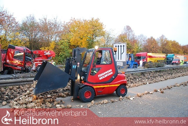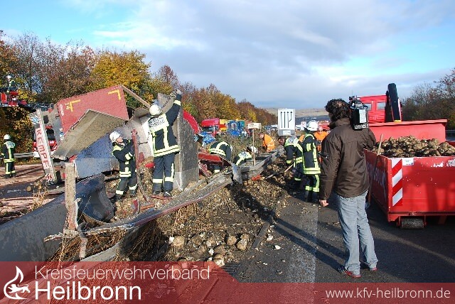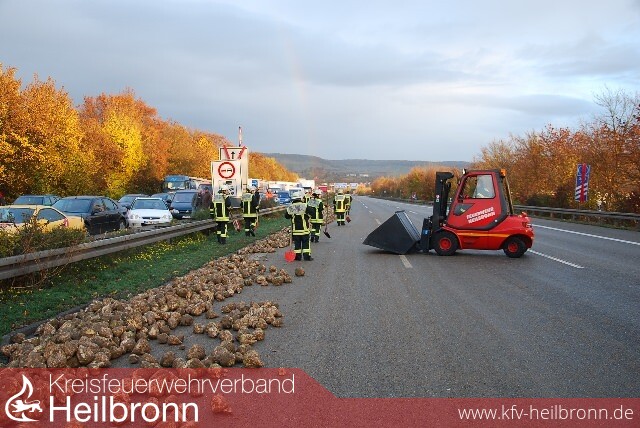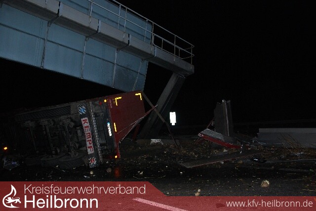 Fast schon an ein Wunder grenzt die Tatsache, dass bei dem schweren Verkehrsunfall am Freitagmorgen nicht noch mehr Autos in Mitleidenschaft gezogen wurden. Ein mit etwa 20 Tonnen Zuckerrüben beladener Sattelzug war gegen 05.30 Uhr auf der BAB 81 in Richtung Würzburg unterwegs, als wenige hundert Meter vor der Überleitung in Richtung Nürnberg an dem Fahrzeug vorn links ein Reifen platzte. Der 72-jährige Fahrer konnte dadurch seinen Lkw nicht mehr in der Spur halten, geriet nach links gegen die Mittelleitplanke und riss die linke Säule der Schilderbrücke aus der Verankerung. Während diese Schilderbrücke direkt auf die Fahrbahn Richtung Würzburg fiel, durchbrach der Lkw-Fahrer die Mittelleitplanke, riss die linke Säule der Schilderbrücke in Fahrtrichtung Stuttgart ab und kippte mit dem gesamten Sattelzug auf die Seite, so dass sich sämtliche Zuckerrüben über die Fahrbahnen verteilten. Außer dem Auto eines 32-Jährigen, welchem noch einige Rüben auf seinen Opel geschleudert wurden, wurde kein weiteres Fahrzeug in Mitleidenschaft gezogen. Die Schilderbrücke auf der Fahrbahn in Richtung Stuttgart wurde nicht komplett abgerissen, sondern hing schräg über alle Fahrstreifen an noch einer Säule.