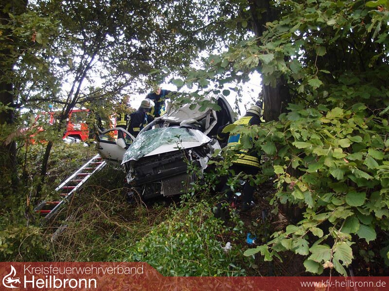 Die Feuerwehr Neckarsulm wurde zusammen mit der Abteilung Dahenfeld zu einem schweren Verkehrsunfall auf der L1095 zwischen Amorbach und Dahenfeld alarmiert. Beim Eintreffen an der Einsatzstelle kurz vor Ortseinfahrt Dahenfeld stellte sich für die Feuerwehr folgende Lage dar. Ein PKW war von der Straße abgekommen und mit der Fahrerseite gegen einen Baum an einer steilen Böschung geprallt. Die Fahrerin des PKW war in ihrem Fahrzeug eingeklemmt. Der Zugang zur schwer verletzten Fahrerin gestaltete sich schwierig. Zum einen aufgrund der steilen Böschung, zum anderen da der Baum den Zugang zur Fahrertüre versperrte.