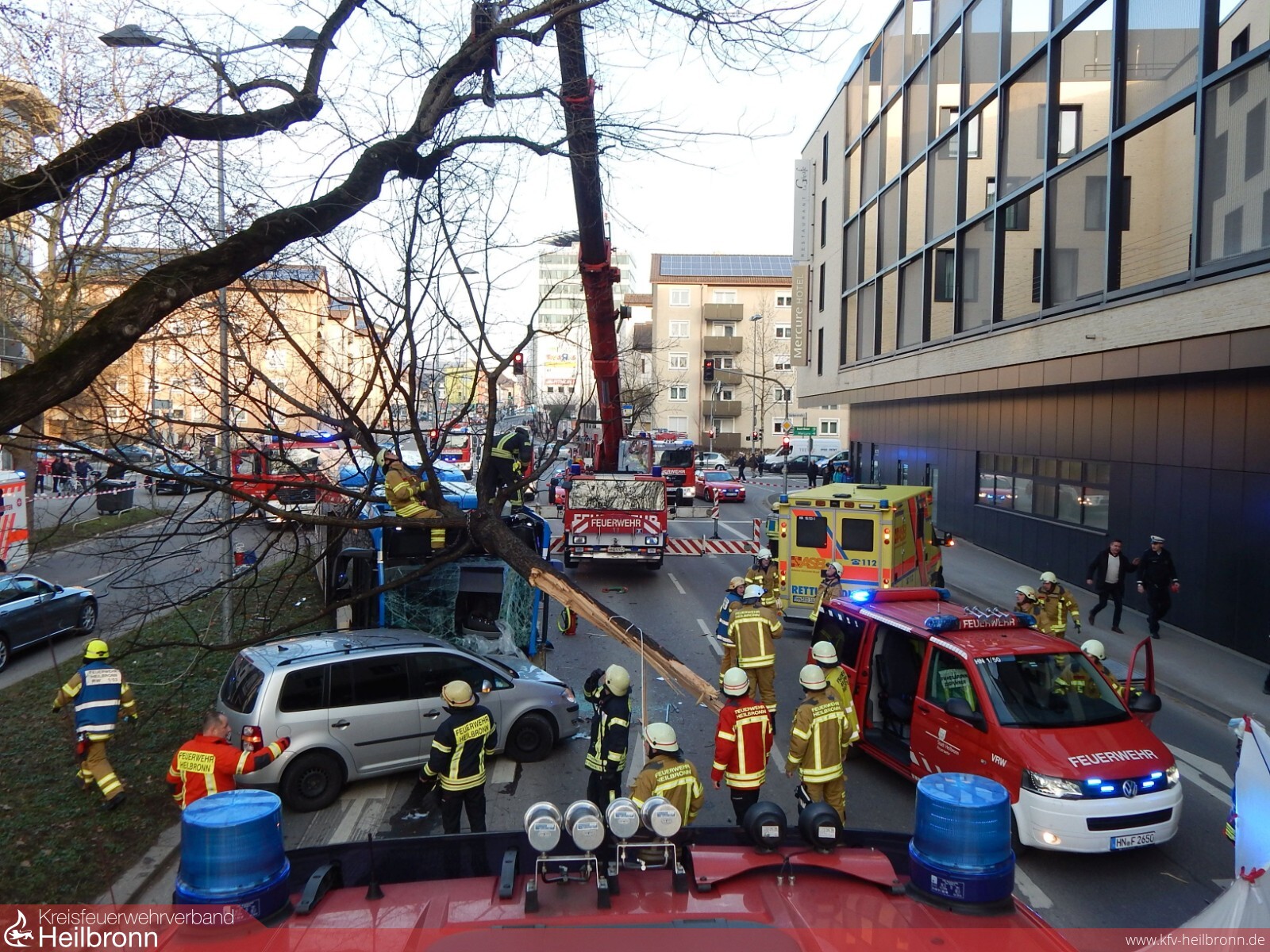 Die Einsatzkräfte befreiten den eingeklemmten Busfahrer. Hierbei kamen maschinelle Zugeinrichtungen sowie hydraulische Rettungsgeräte zum Einsatz. Mit dem Feuerwehrkran musste der abgerissene Baum auf dem Dach des Busses gesichert werden.