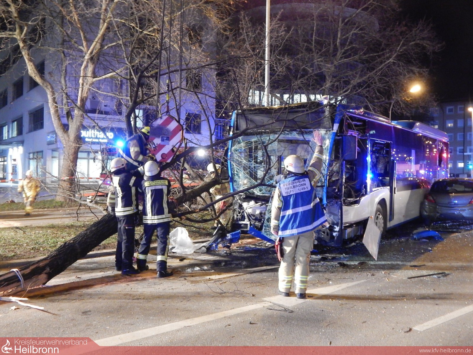 Die Einsatzkräfte befreiten den eingeklemmten Busfahrer. Hierbei kamen maschinelle Zugeinrichtungen sowie hydraulische Rettungsgeräte zum Einsatz. Mit dem Feuerwehrkran musste der abgerissene Baum auf dem Dach des Busses gesichert werden.