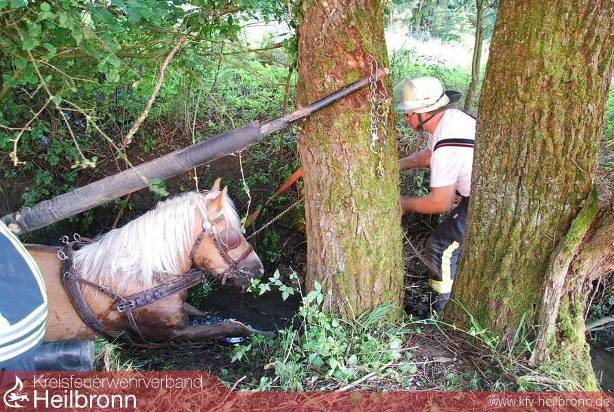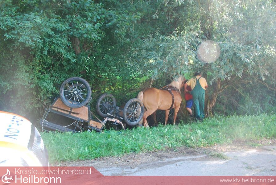 Am Mittwoch, dem 23.07.2014, gegen 18.47 Uhr, befuhr ein 54-Jähriger aus Ellhofen mit einem Zweispänner den Steinsfelderweg von der Brühtalstraße in Richtung Stadtseeweg. Auf der Kutsche saßen noch die 55jährige Lebensgefährtin des Kutschers sowie ein 51jähriger Neudenauer. Beim Schafstall hielt die Kutsche auf einem Wiesengelände kurz an, als plötzlich die Pferde durchgingen und mit der besetzten Kutsche einen engen Kreisbogen einschlugen.