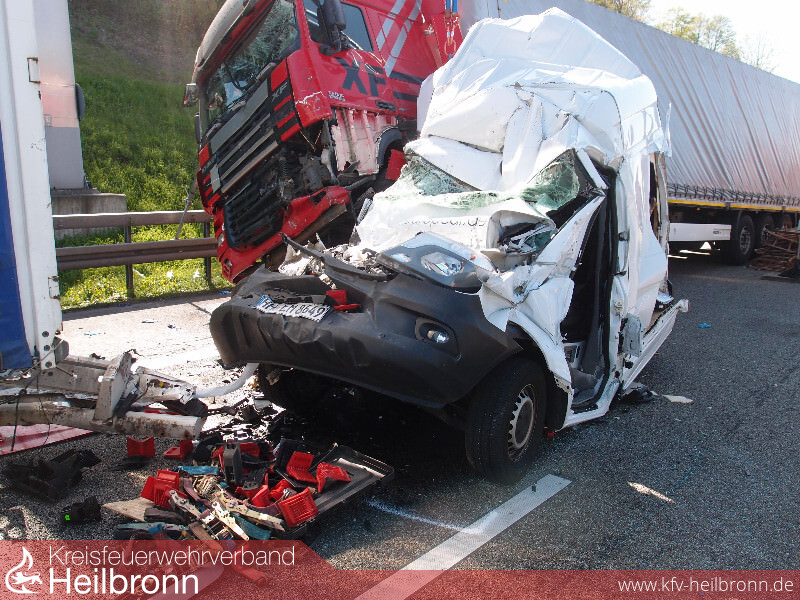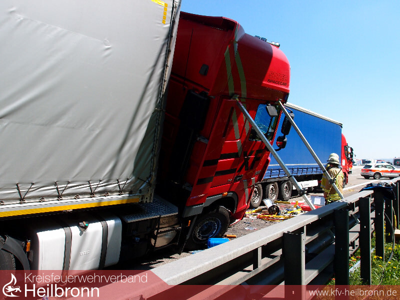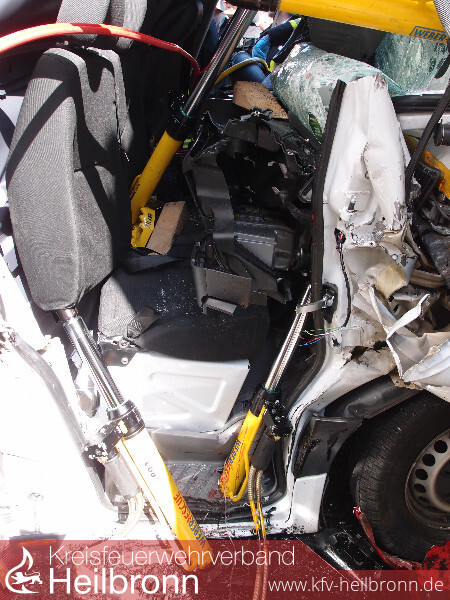 Die Feuerwehren Neckarsulm und Heilbronn wurden zu einem schweren Verkehrsunfall mit vier beteiligten Fahrzeugen auf die BAB6 in Fahrtrichtung Nürnberg gerufen. Ein Kleintransporter wurde in Folge des Unfalls zwischen zwei Sattelzügen eingekeilt. Fahrer und Beifahrer waren schwerst eingeklemmt. Die Hinterachse des Kleintransporters hing zudem in der Luft, so dass als Erstmaßnahme das Fahrzeug und die aufgefahrene Zugmaschine gesichert werden mussten. Erst nach entsprechenden Sicherungsmaßnahmen konnte begonnen werden, sich einen Zugang zu den eingeklemmten Personen zu schaffen.