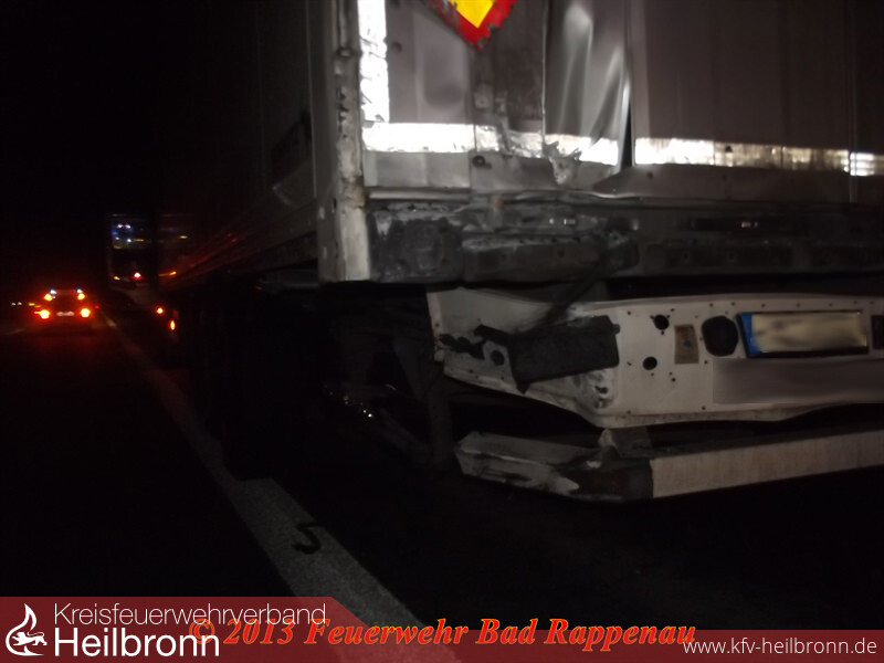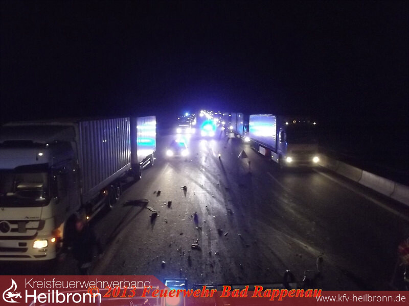 Aus bislang ungeklärter Ursache streife ein PKW einen vorausfahrenden LKW und schleuderte in einen weiteren davor fahrenden Sattelzug.