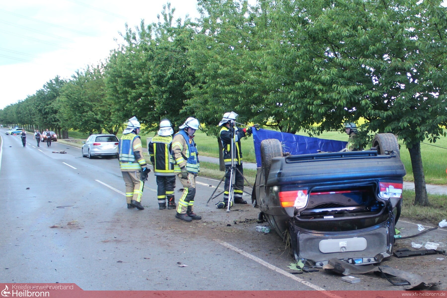 Beim Eintreffen der Einsatzkräfte wurde der allein im Unfallfahrzeug befindliche Fahrer bereits von Ersthelfern aus seinem auf dem Dach liegenden und total zerstörten Fahrzeug befreit und umgehend vom Rettungsdienst übernommen. Von der Feuerwehr wurde der Brandschutz sichergestellt und zum Schutz der Persönlichkeitsrechte ein Sichtschutz für den Patienten aufgebaut.