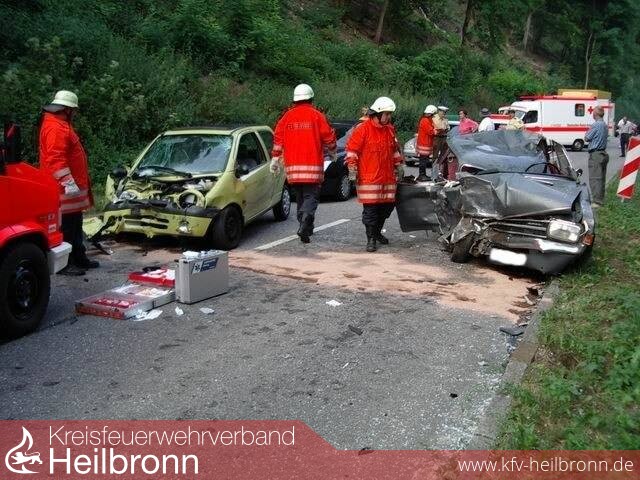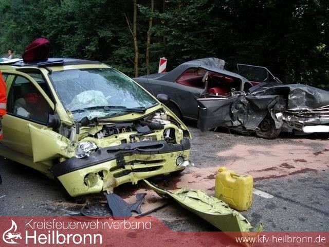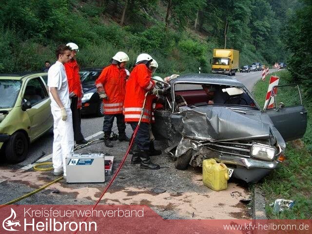 Auf der L 1095 zwischen Züttlingen und Möckmühl waren zwei Pkw frontal miteinander kollidiert. Vermutlich durch Unachtsamkeit und überhöhte Geschwindigkeit kam eine Renault Twingo- Fahrerin in Fahrtrichtung Züttlingen auf die Gegenfahrbahn und prallte dort auf einen 34 Jahre alten Opel Rekord. Der Fast-Oldtimer war mit einem Fahrer und dessen 10 Jahre alten Sohn besetzt. Der Fahrer konnte sich verletzt aus dem Wrack befreien, während der Junge schwer verletzt im Fußraum eingeklemmt war. Die Renault-Fahrerin war ebenfalls verletzt und eingeklemmt. Sie konnte aber von hinzu gekommenen Ersthelfern, bis zum Eintreffen der Feuerwehr, befreit werden.
