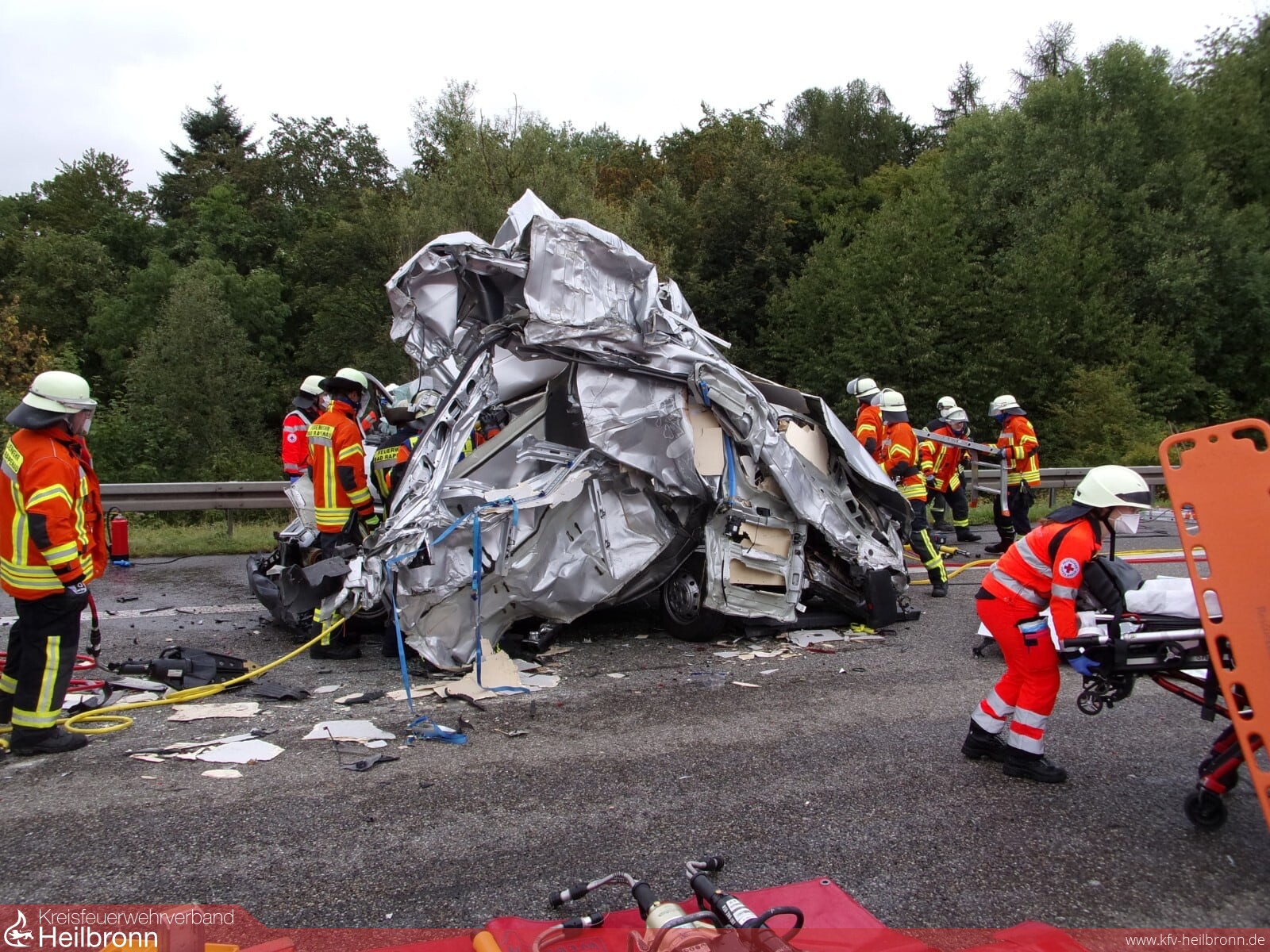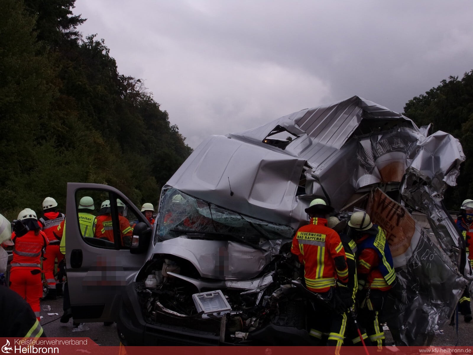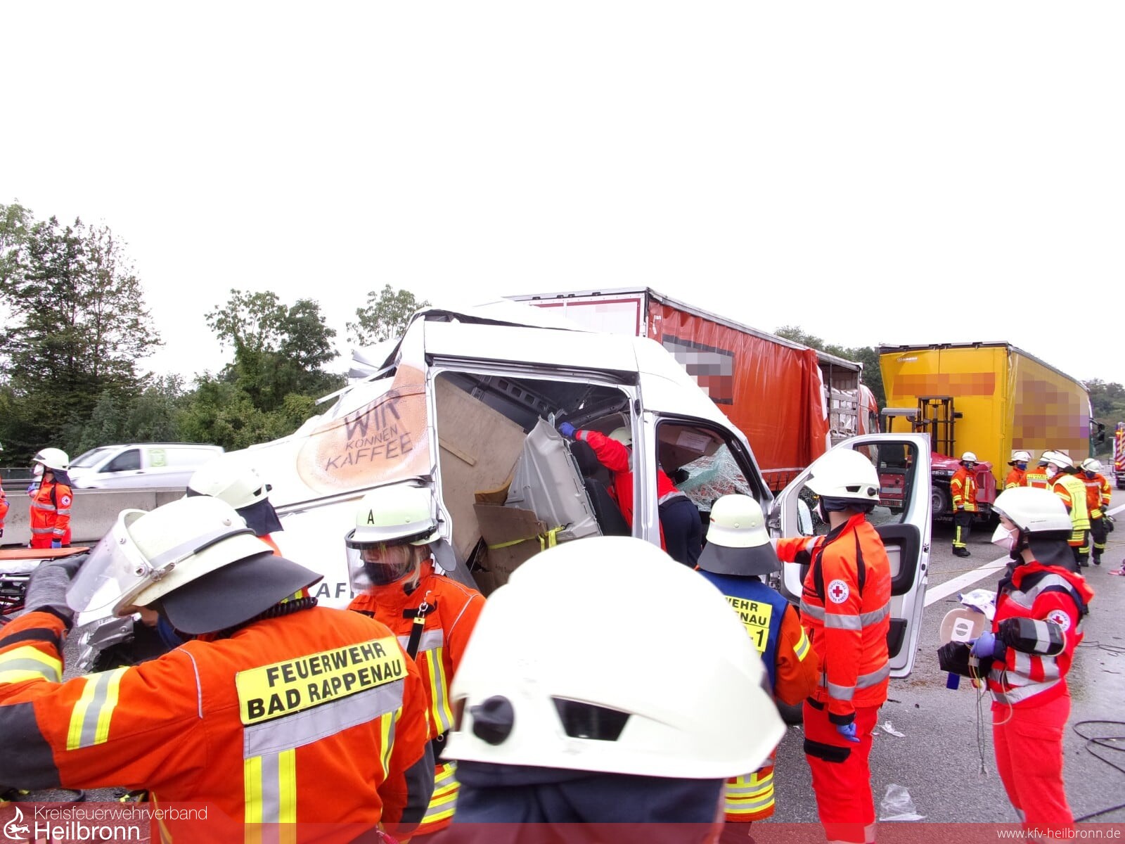 Mit dem Alarmstichwort „Verkehrsunfall LKW 1 Person eingeklemmt“ wurden die Abteilungen Bad Rappenau und Süd der Freiwilligen Feuerwehr Bad Rappenau auf die Autobahn 6 in Fahrtrichtung Mannheim alarmiert. Gegen 12.34 Uhr konnte der Fahrer eines Sattelzugs am Stauende zwischen Bad Rappenau und Sinsheim-Steinsfurt seine Geschwindigkeit rechtzeitig drosseln und war im Begriff gänzlich anzuhalten. Ein dahinter fahrender Mann bremste seinen Transporter mit Anhänger ebenfalls noch rechtzeitig ab. Dem Fahrer eines portugiesischen Sattelzugs, der ebenfalls in Richtung Mannheim fuhr, gelang dies nicht. Er fuhr mit seinem Gespann nahezu ungebremst auf den Anhänger und den Transporter auf und schob diesen auf den weiteren Sattelzug auf. Hierbei wurde der Fahrer des Transporters in seinem völlig deformierten Fahrzeug eingeklemmt. Die Feuerwehr Bad Rappenau leitete unter Absprache mit dem Rettungsdienst die technische Rettung ein. Hierzu wurde das verunfallte Gespann mittels Unterlegkeilen und maschineller Zugeinrichtung des Rüstwagens gesichert. Anschließend wurde der vordere LKW weggefahren und die Rettung über die Rück- und Fahrerseite eingeleitet. Durch den Einsatz mehrerer hydraulischer Rettungssätze und einer Säbelsäge konnte der Fahrer von der Feuerwehr Bad Rappenau befreit und dem Rettungsdienst übergeben werden. Der Schwerverletzte wurde mit dem Rettungstransporthelikopter in ein Krankenhaus geflogen. Der Sachschaden wird auf über 100.000 Euro geschätzt. Die Autobahn war voll gesperrt. Die Feuerwehr Bad Rappenau war mit 6 Fahrzeugen und circa 27 Mann im Einsatz.