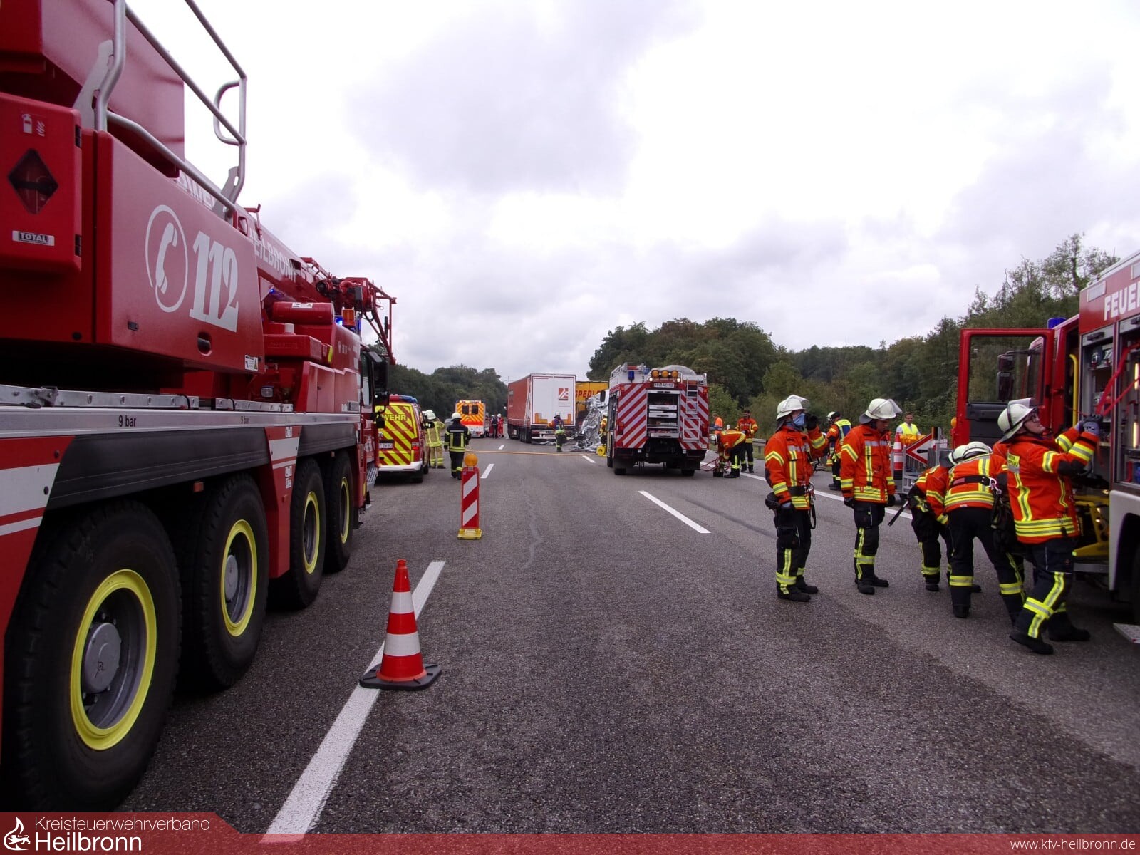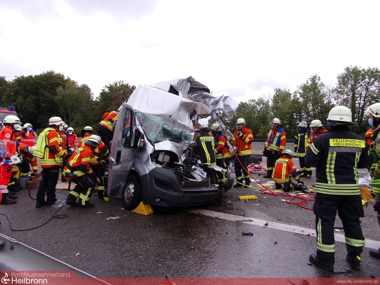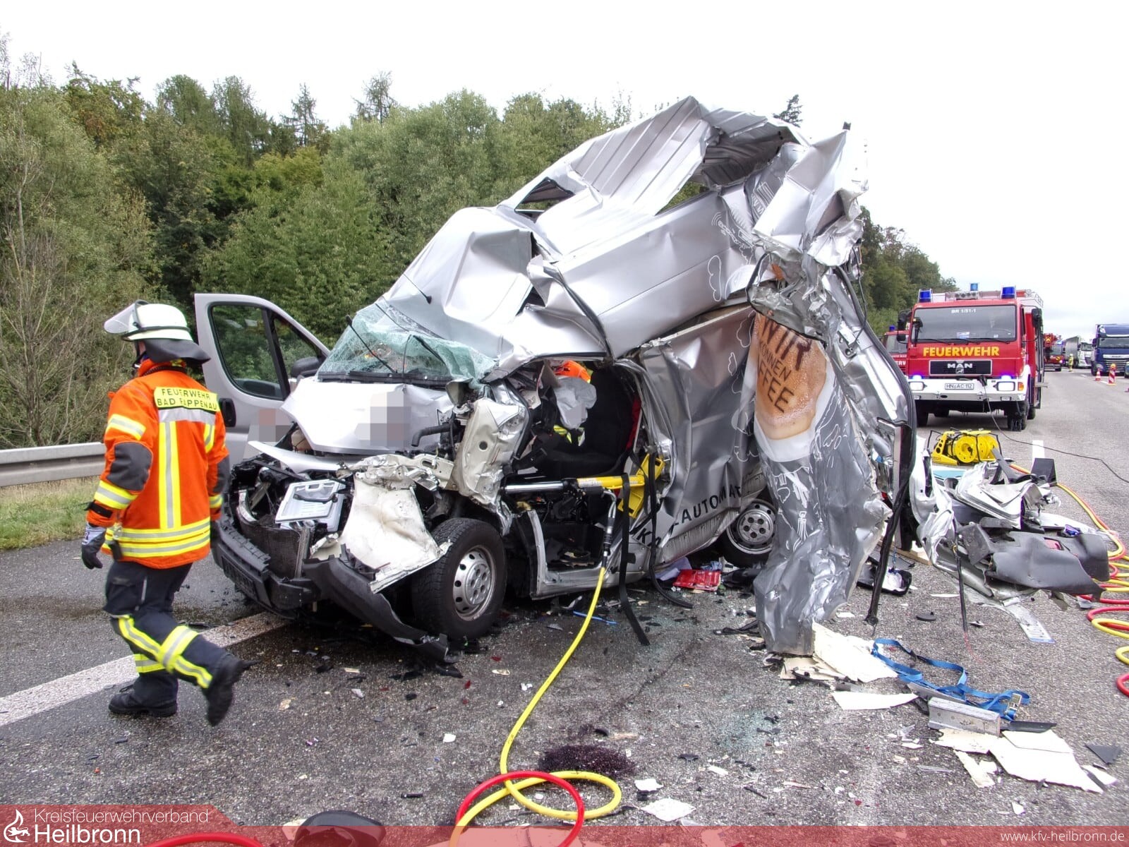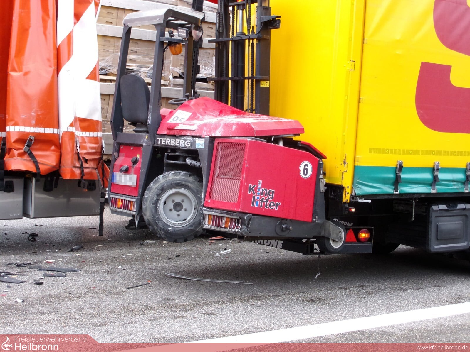 Mit dem Alarmstichwort „Verkehrsunfall LKW 1 Person eingeklemmt“ wurden die Abteilungen Bad Rappenau und Süd der Freiwilligen Feuerwehr Bad Rappenau auf die Autobahn 6 in Fahrtrichtung Mannheim alarmiert. Gegen 12.34 Uhr konnte der Fahrer eines Sattelzugs am Stauende zwischen Bad Rappenau und Sinsheim-Steinsfurt seine Geschwindigkeit rechtzeitig drosseln und war im Begriff gänzlich anzuhalten. Ein dahinter fahrender Mann bremste seinen Transporter mit Anhänger ebenfalls noch rechtzeitig ab. Dem Fahrer eines portugiesischen Sattelzugs, der ebenfalls in Richtung Mannheim fuhr, gelang dies nicht. Er fuhr mit seinem Gespann nahezu ungebremst auf den Anhänger und den Transporter auf und schob diesen auf den weiteren Sattelzug auf. Hierbei wurde der Fahrer des Transporters in seinem völlig deformierten Fahrzeug eingeklemmt. Die Feuerwehr Bad Rappenau leitete unter Absprache mit dem Rettungsdienst die technische Rettung ein. Hierzu wurde das verunfallte Gespann mittels Unterlegkeilen und maschineller Zugeinrichtung des Rüstwagens gesichert. Anschließend wurde der vordere LKW weggefahren und die Rettung über die Rück- und Fahrerseite eingeleitet. Durch den Einsatz mehrerer hydraulischer Rettungssätze und einer Säbelsäge konnte der Fahrer von der Feuerwehr Bad Rappenau befreit und dem Rettungsdienst übergeben werden. Der Schwerverletzte wurde mit dem Rettungstransporthelikopter in ein Krankenhaus geflogen. Der Sachschaden wird auf über 100.000 Euro geschätzt. Die Autobahn war voll gesperrt. Die Feuerwehr Bad Rappenau war mit 6 Fahrzeugen und circa 27 Mann im Einsatz.