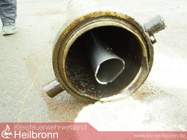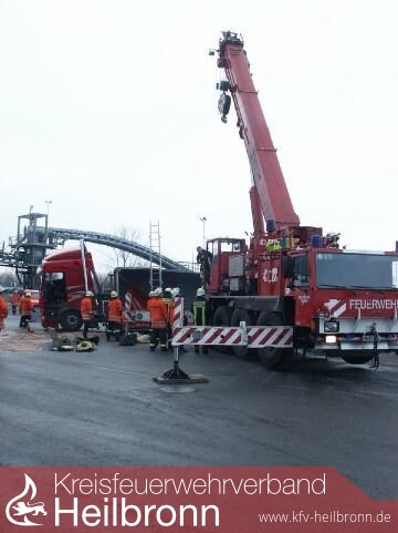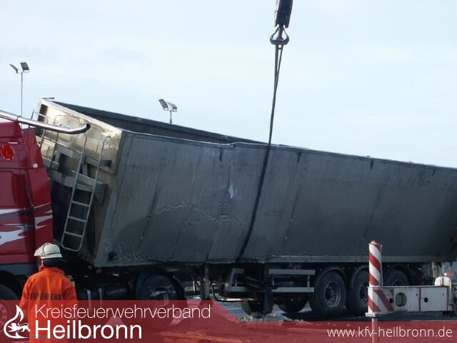 Nachdem nicht mit 100%iger Sicherheit gesagt werden konnte, dass sich unter dem umgefallenen Auflieger keine Person mehr befand, wurde dieser mit Hebekissen angehoben und später mit dem aufgrund des Einsatzstichwortes sofort alarmierten Feuerwehrkran der Berufsfeuerwehr Heilbronn weiter angehoben und aufgerichtet. Hierbei kam auch die Seilwinde des Rüstwagens zum Einsatz. Anschließend wurde der Auflieger mit Spannbändern gesichert. Parallel zu diesen Arbeiten wurde mit Ölbindemittel das ausgelaufene Hydrauliköl gebunden und aufgenommen.