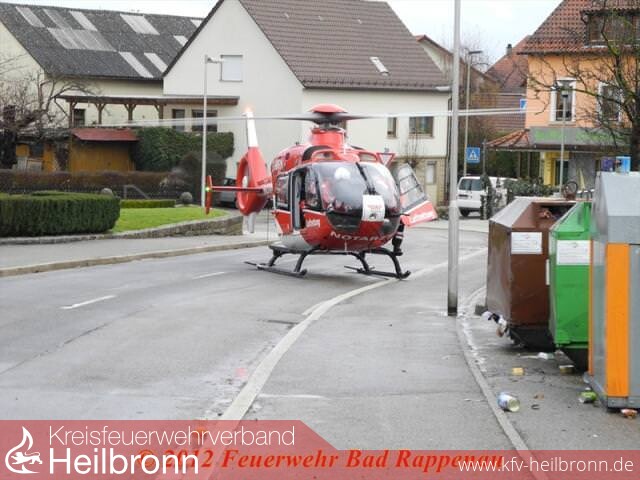 Anschließend wurde die Person aus dem Gebäude zum Rettungswagen gebracht, wo die weitere Versorgung stattfand. Auf Grund der schweren Brandverletzungen wurde der Verletzte anschließend mit einem Rettungshubschrauber abtransportiert.