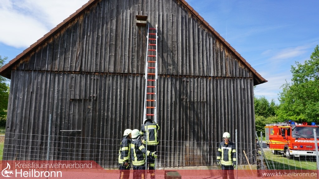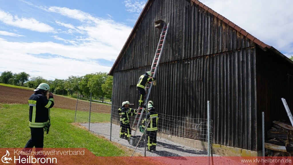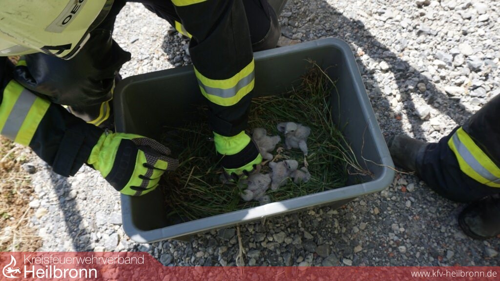 Die Feuerwehr Untergruppenbach wurde alarmiert, da sich sechs Jungfalken in einem Nest an einer Feldscheune befanden und nicht mehr ausreichend mit Futter versorgt werden konnten. Grund hierfür war der Tod eines Elternteils der Greifvögel. Dieser war bei einem Zusammenprall mit einem KFZ verendet.