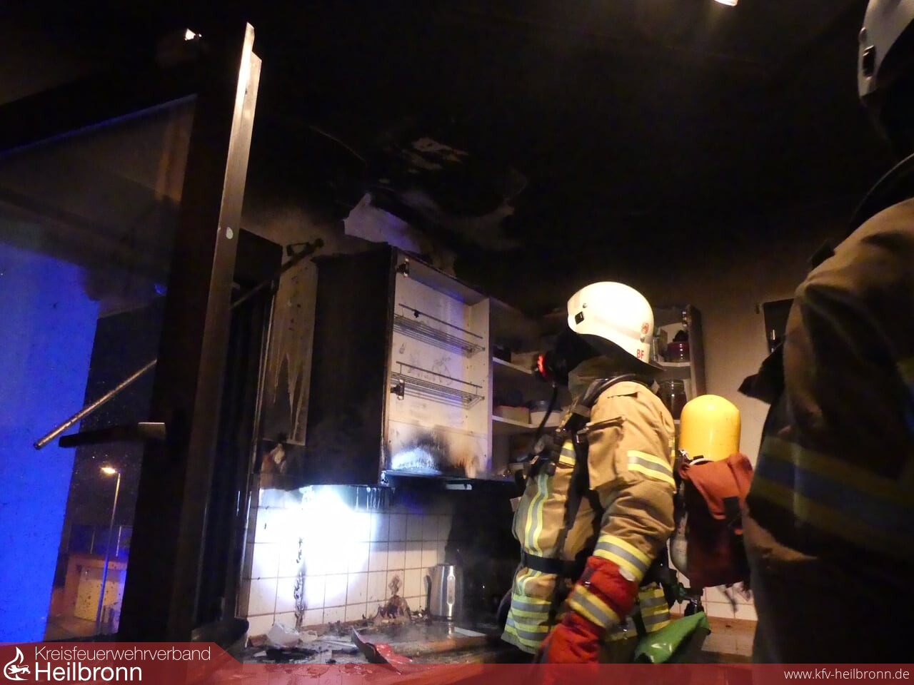 Die Feuerwehr rückte gegen 19.50 Uhr zu einem Küchenbrand in die Frankenbacher Straße nach Heilbronn-Neckargartach aus. Im ersten Obergeschoss eines Reiheneckhauses war ein auf dem eingeschalteten Herd vergessener Topf mit Frittierfett in Brand geraten. Die Flammen hatten bereits auf den Dunstabzug sowie die umliegenden Hängeschränke übergegriffen. Sechs Personen aus der Brandwohnung sowie ein älteres Ehepaar aus dem zweiten Obergeschoss konnten das Gebäude mit Hilfe eines Passanten noch vor dem Eintreffen der Feuerwehr verlassen. Durch das schnelle Vorgehen der Einsatzkräfte war das Feuer bereits um 20.01 Uhr gelöscht. Der 59-jährige Ehemann, zwei Töchter, zwei Kinder als auch der 45-jährige Passant wurden mit Verdacht auf Rauchgasvergiftungen ins Krankenhaus verbracht. Die beiden Bewohner des zweiten Obergeschosses blieben unverletzt. Von der Feuerwehr waren insgesamt 25 Mann der Berufs- und freiwilligen Feuerwehr mit sechs Fahrzeugen im Einsatz. Der Rettungsdienst war mit einem Organisationsleiter Rettungsdienst, einem leitenden Notarzt und den Besatzungen von vier Rettungs- und zwei Krankenwagen vor Ort. Bis auf den 45-Jährigen konnten alle Verletzten das Krankenhaus nach ambulanter Behandlung wieder verlassen. Nach Abschluss der Löscharbeiten wurde das Gebäude für alle Bewohner wieder frei gegeben. Der Sachschaden belief sich auf eine Summe von rund 30.000 Euro.