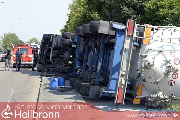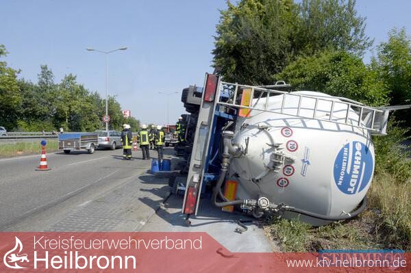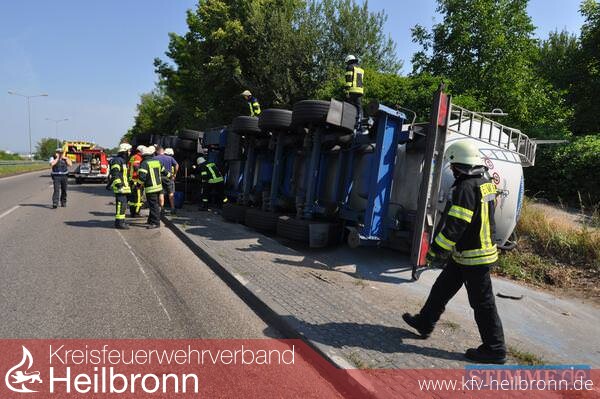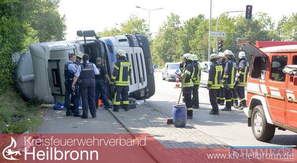 Der Fahrer des 40 Tonnen schweren Silozugs bog gegen 10.30 Uhr aus der Karl-Wüst-Straße in die Neckarsulmer Straße ein und verlor vermutlich infolge nicht angepasster Geschwindigkeit die Kontrolle über sein Fahrzeug, wie die Polizei am Nachmittag mitteilte.