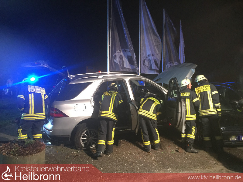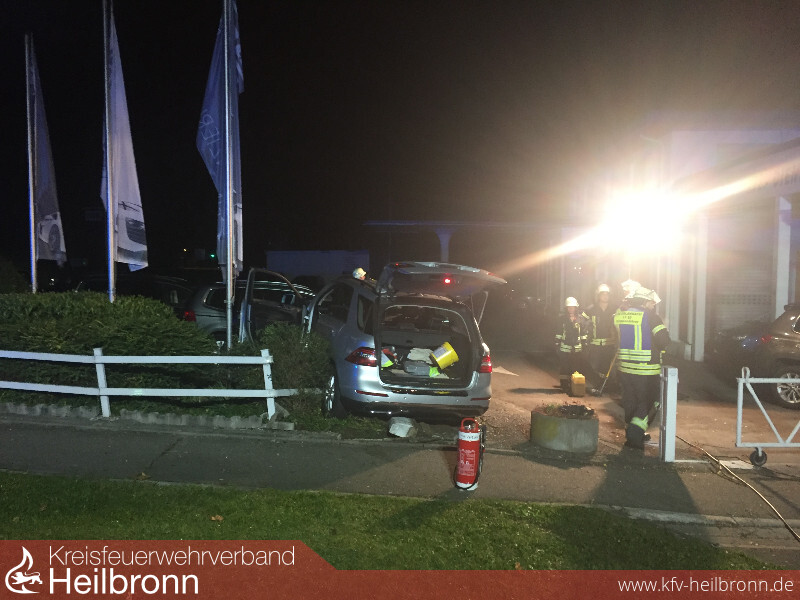 Ein 80-jähriger Daimler-Fahrer war auf der Kreisstraße 2126 von Weinsberg nach Erlenbach unterwegs. Kurz vor der Einmündung in die Landesstraße 1101 kam der Senior in einer Linkskurve nach rechts von der Fahrbahn ab und steuerte auf das Gelände eines Autohauses zu. Dort brachte der Daimler zunächst einen Fahnenmast zu Fall, welcher daraufhin zu Boden stürzte. Danach prallte der Daimler gegen einen abgestellten Mini und dieser wurde wiederum gegen einen ebenfalls geparkten VW Sharan geschoben. Zum Glück blieben die beiden Insassen in dem Daimler, der 80-jährige Fahrer sowie seine 77-jährige Beifahrerin, nach ersten Erkenntnissen unverletzt. Es entstand jedoch ein hoher Sachschaden. Dieser dürfte bei dem Daimler einen Totalschaden in Höhe von 15 000 Euro, bei dem Mini einen Totalschaden in Höhe von 10 000 Euro und bei dem Sharan ein Sachschaden in Höhe von ca. 12 000 Euro bedeuten. Der Schaden an dem Fahnenmast fällt dabei eher gering aus. Die Schadenshöhe ist hier noch unbekannt.