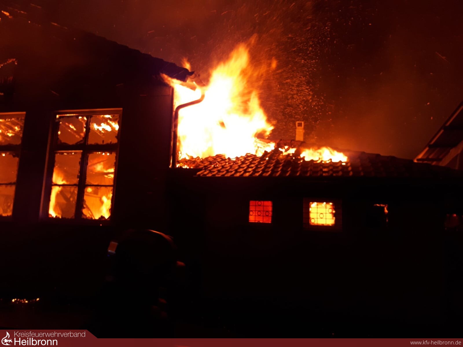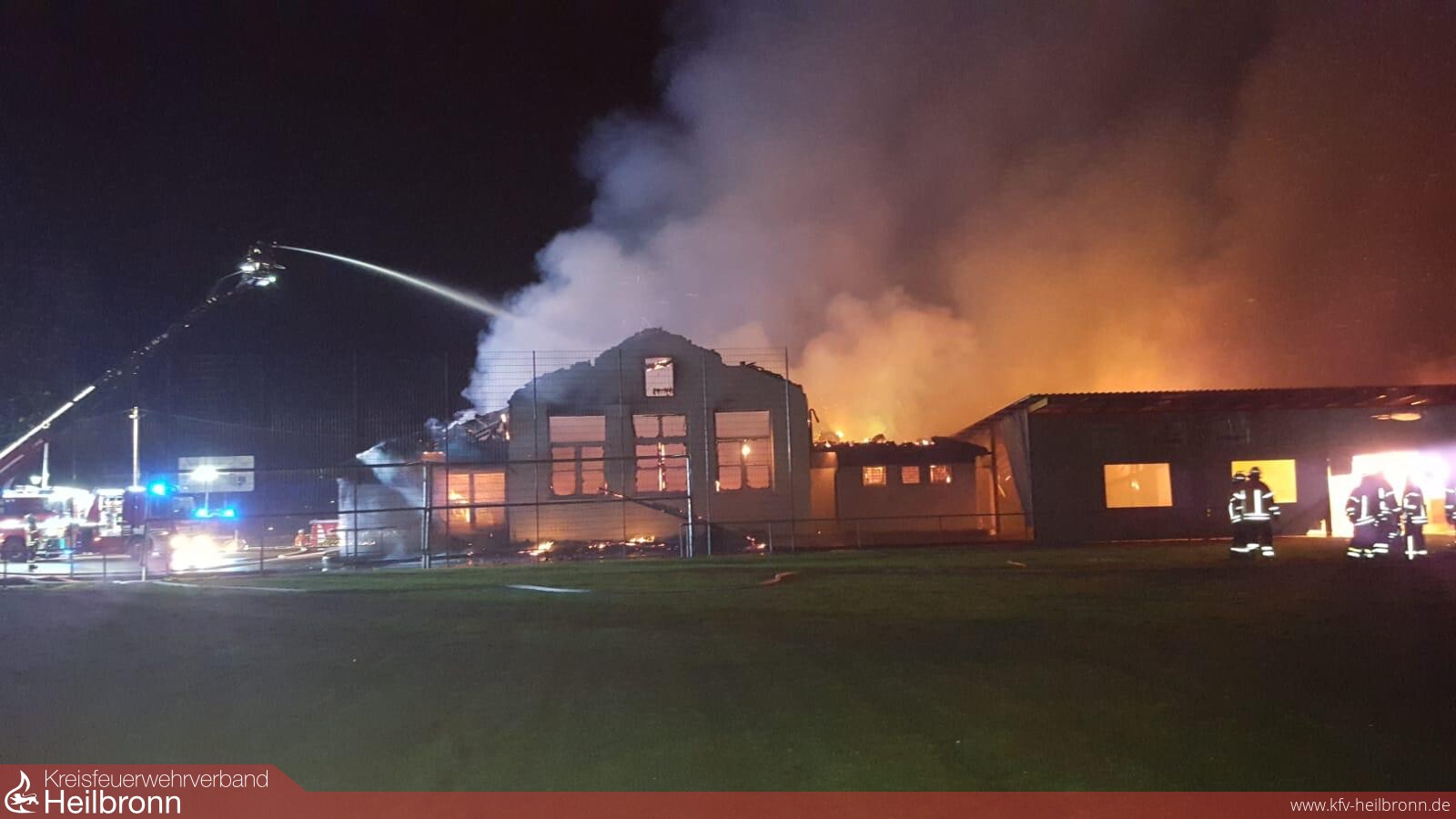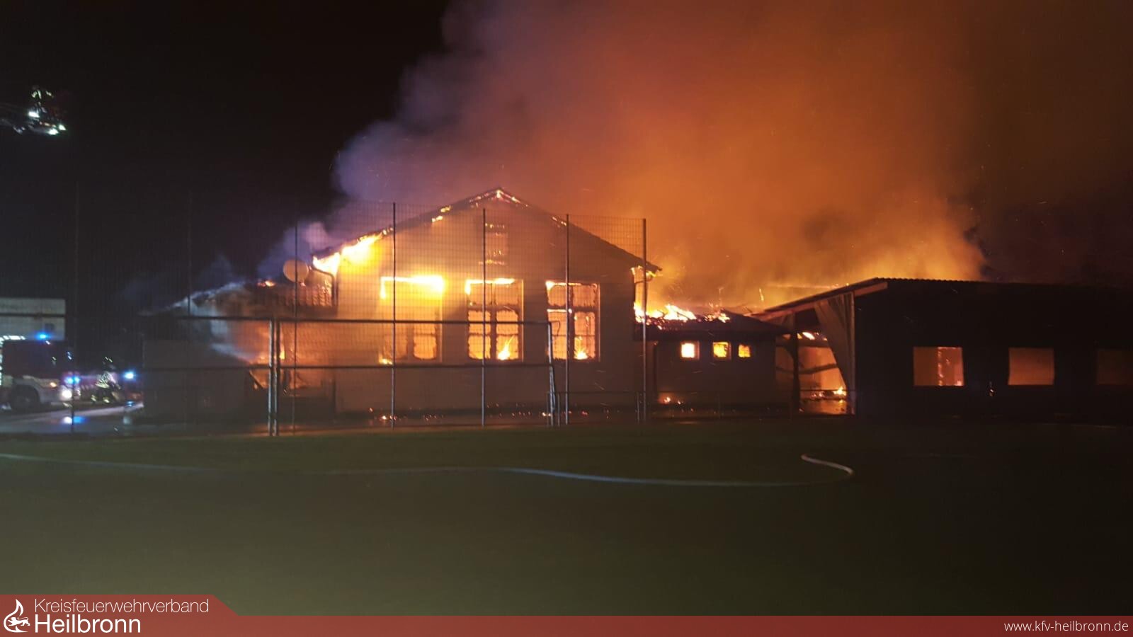 Zu einer Rauchentwicklung Richtung Höchstberg wurden die Abteilungen Höchstberg und Gundelsheim am Freitagabend alarmiert. Noch während der Anfahrt erfolgte aufgrund zahlreicher weiterer Anrufe eine Änderung des Alarmstichworts auf Gebäudebrand Sportheim Tiefenbach. Dies hatte die Alarmierung weiterer Abteilungen der Feuerwehr Gundelsheim sowie der Drehleiter der Feuerwehr Bad Friedrichshall zur Folge. Beim Eintreffen der ersten Kräfte standen das gesamte Gebäude sowie der Dachstuhl bereits in Vollbrand. Daraufhin wurde ein Löschzug der Feuerwehr Bad Friedrichshall sowie die Abrollbehälter Tank/Wasser der Feuerwehren Neckarsulm und Heilbronn nachalarmiert. Dank des schnellen und energischen Eingreifens der Feuerwehrkräfte konnte eine Ausbreitung auf den angrenzenden Wald verhindert werden. Das Feuer war nach ca. 2 Stunden unter Kontrolle, die Nachlöscharbeiten zogen sich bis zum Morgen hin. Ebenfalls im Einsatz waren das DRK OV Gundelsheim sowie Baufachberater des THW Widdern. Vielen Dank an dieser Stelle an die eingesetzten Feuerwehren, das DRK und das THW für die sehr gute Zusammenarbeit. Danke auch an die Stadtverwaltung, Frau Bürgermeisterin Schokatz und den Bauhof für die Unterstützung. Last but not least ein Dankeschön an Ortsvorsteher Ziegler, die Sportfreunde Tiefenbach und den DRK OV Gundelsheim, die trotz des schlimmen Brandes die Einsatzkräfte unterstützten und nachts und am Vormittag verpflegten.