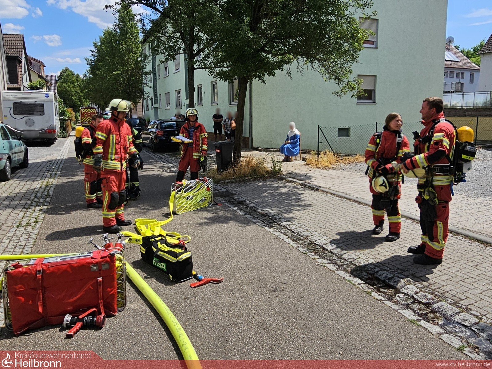 Wenige Minuten nach der Alarmierung traf der Löschzug an der Einsatzstelle ein. Im Bereich der Wohnung wurde starke Verrauchung festgestellt. Das Treppenhaus war rauchfrei. Nahezu alle Hausbewohner konnten das Haus selbständig verlassen, sodass sich die Erstmaßnahmen auf das Setzen eines Rauchvorhangs und die Einleitung der Brandbekämpfung durch einen Trupp mit Atemschutz beschränkt hatten. Der Brandherd konnte schnell lokalisiert und durch den Angriffstrupp des HLF gelöscht werden. Ein weiterer Trupp überprüfte parallel die anderen Wohnungen im Hause. Im ersten Obergeschoss, oberhalb der vom Brand betroffenen Wohnung, konnte eine ältere Dame und im 2. Obergeschoss ein fünfjähriges Kind durch die Einsatzkräfte angetroffen und problemlos ins Freie gebracht werden.