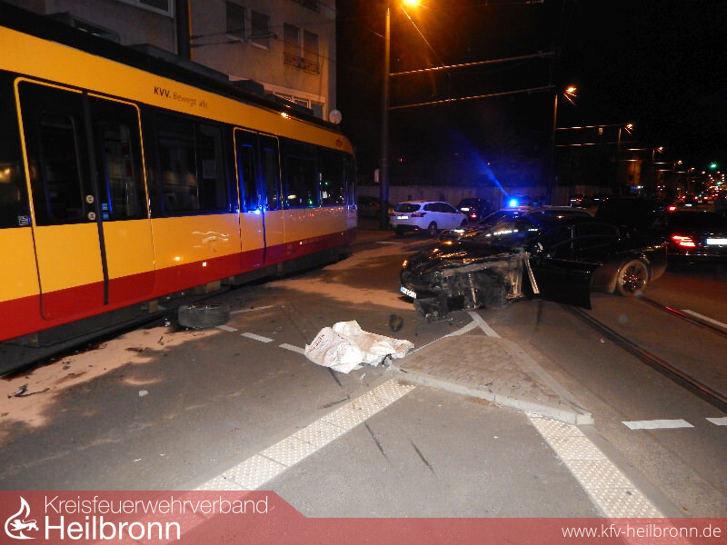 Gegen 01.14 Uhr verlor ein Autofahrer die Kontrolle über seinen Maserati auf der Weinsberger Straße, Abzweigung Paulinenstraße. Nach kurzer Schleuderfahrt krachte der exklusive Sportwagen seitlich in ein dort abbiegendes Stadtbahnfahrzeug.