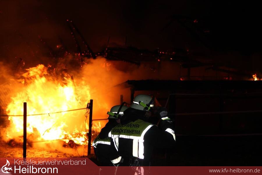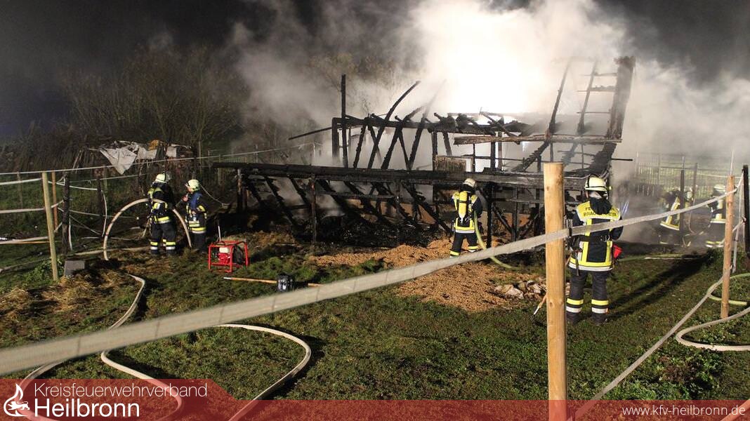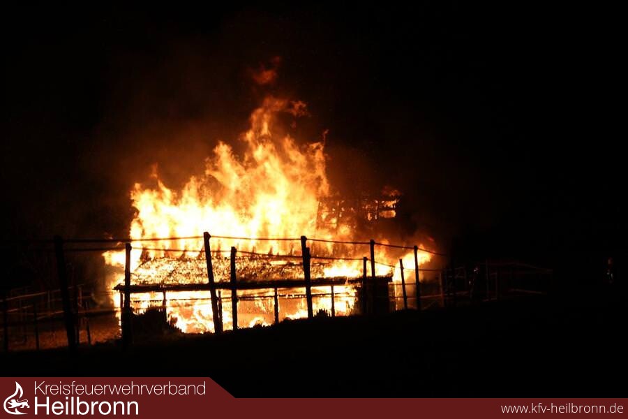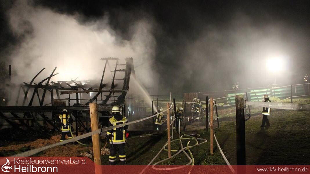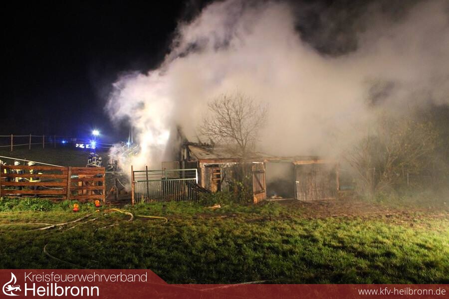 Pferdestall abgebrannt Am 01.12.2014 gegen 20.32 wurde ein Brand in Brackenheim-Dürrenzimmern im Gewann Klinge gemeldet. Aus bisher unbekannter Ursache brach in einer Scheune, welche als Pferdeunterstand genutzt wurde, ein Feuer aus. Dieses breitete sich rasend schnell aus, weshalb binnen kürzester Zeit ein Vollbrand entstand. In der Scheune befanden sich zum Zeitpunkt des Brandausbruches 4 Pferde, 1 Hund und 4 Katzen. Personen waren keine vor Ort. Nach ersten Kenntnissen verendeten bei dem Brand 2 Pferde und der Hund. Der Brandort konnte aufgrund akuter Einsturzgefahr noch nicht betreten werden. Da laut Eigentümer alle Türen verschlossen waren, muss davon ausgegangen werden, dass auch die beiden anderen Pferde bei dem Feuer verendet sind. Der Sachschaden beläuft sich nach ersten Schätzungen auf ca. 60000 bis 80000 Euro. Der Wert der einzelnen Pferde ist noch nicht bekannt. Über die Brandursache kann noch nichts gesagt werden. Die Feuerwehr war mit insgesamt 60 Einsatzkräften am Einsatzort. Der Rettungsdienst war mit 10 Einsatzkräften sowie Notfallseelsorger für die betroffenen Tierhalter vor Ort. Personen kamen nicht zu schaden. Der Brand konnte gegen 21:35 Uhr gelöscht werden. Durch die Feuerwehr wurde eine Brandwache eingerichtet.