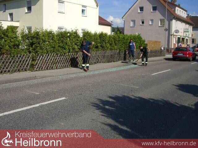 Die Straße sah tatsächlich aus als ob großflächig eine Menge an Glaskrümel auf ca. 30 m Länge über die gesamte Fahrbahnbreite verstreut worden wären. Die Glaskrümel wurden zusammengekehrt und aufgenommen. Hierzu musste die Straße anfangs vollständig, später halbseitig gesperrt werden.