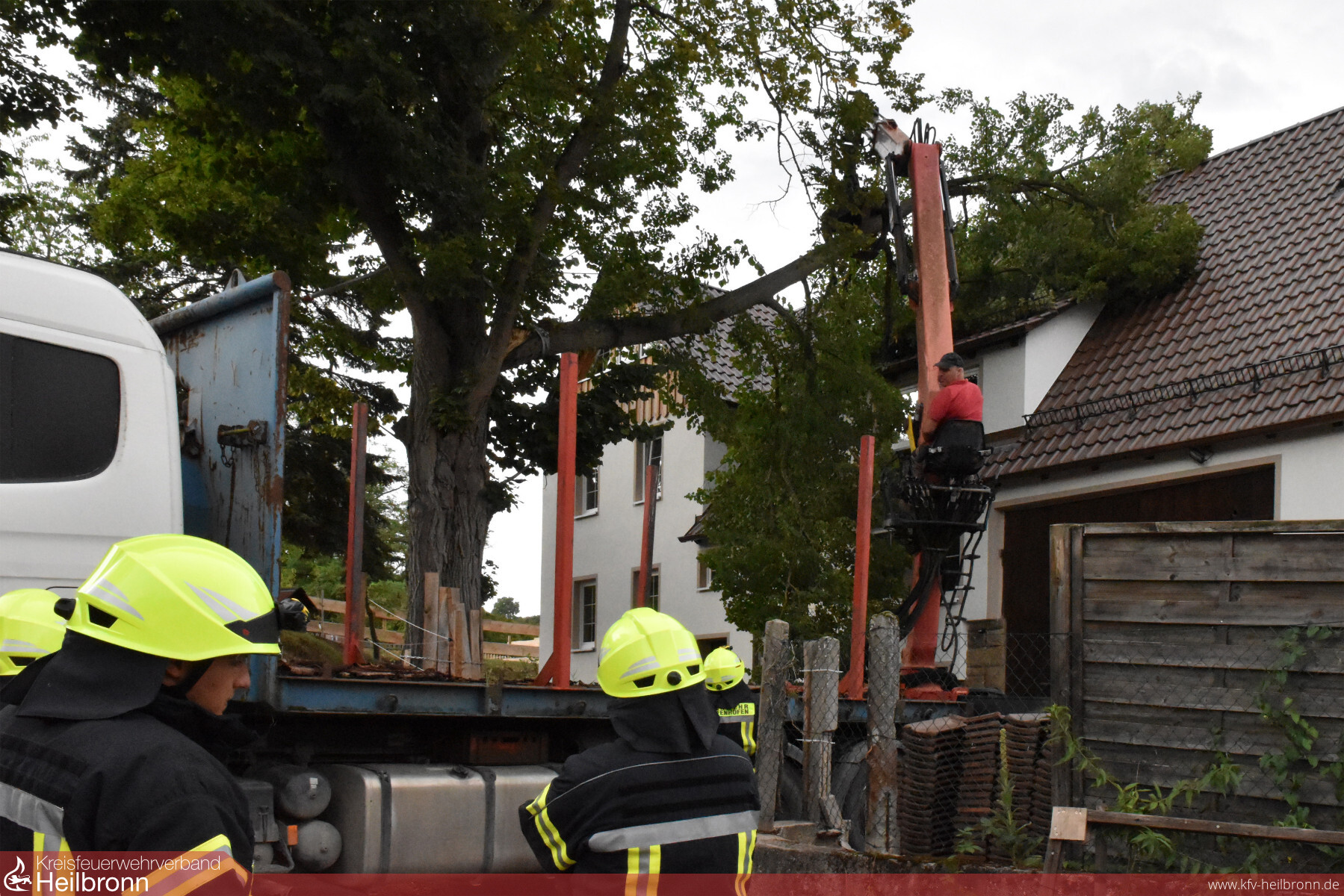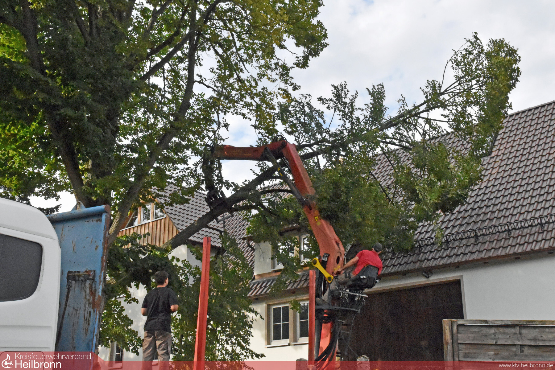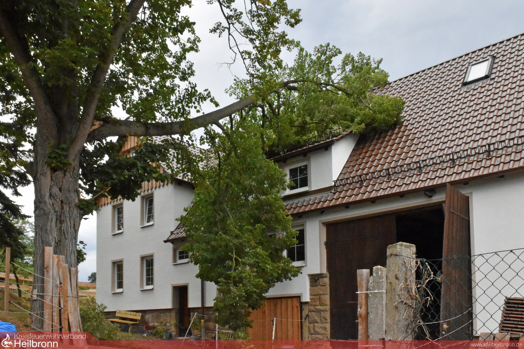 Öffentliche Straßen und Wege waren von dem Sturmschaden jedoch nicht betroffen. Die trotzdem alarmierte Freiwillige Feuerwehr Pfaffenhofen rückte mit zwei Fahrzeugen und 15 Einsatzkräften an. Zum Beseitigen des Astes musste sie sich allerdings Unterstützung durch einen Forstbetrieb holen. Die Güglinger Holzrückefirma konnte mit Hilfe ihres LKW-Krans und einer Seilwinde den Ast schließlich gefahrlos vom Dach holen. Am Dach selbst waren nur wenige Dachziegel beschädigt.