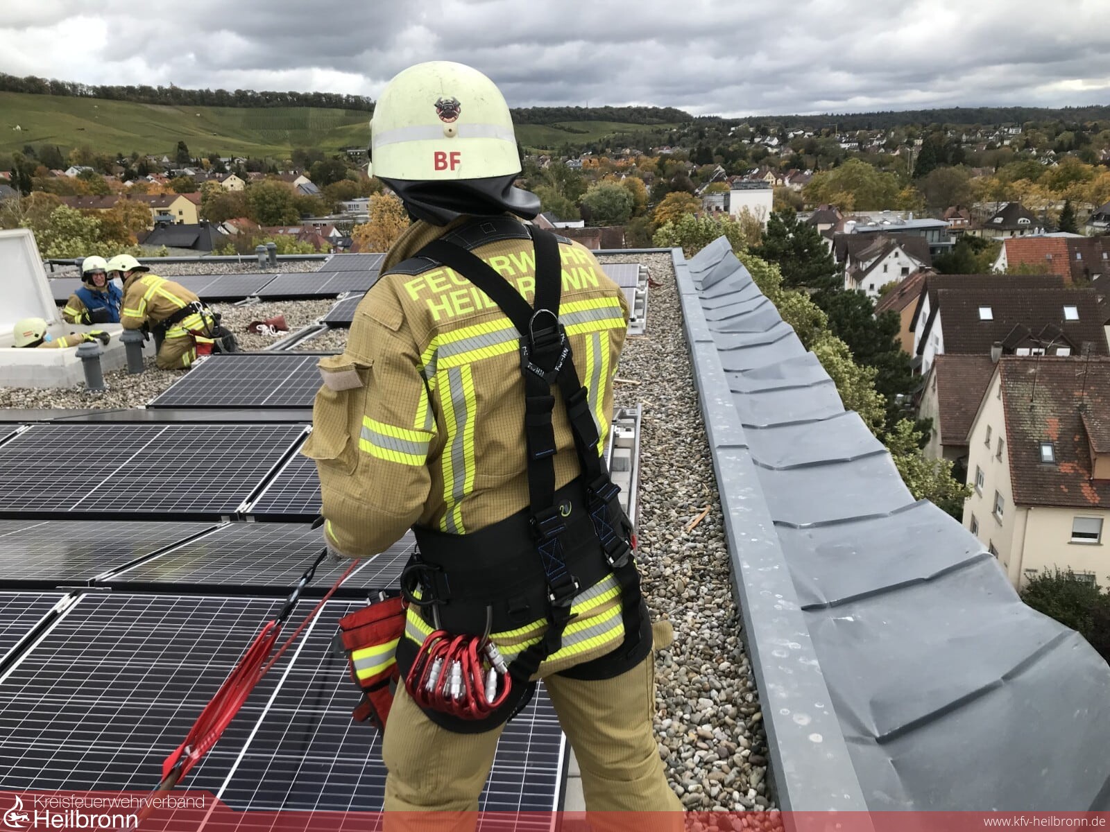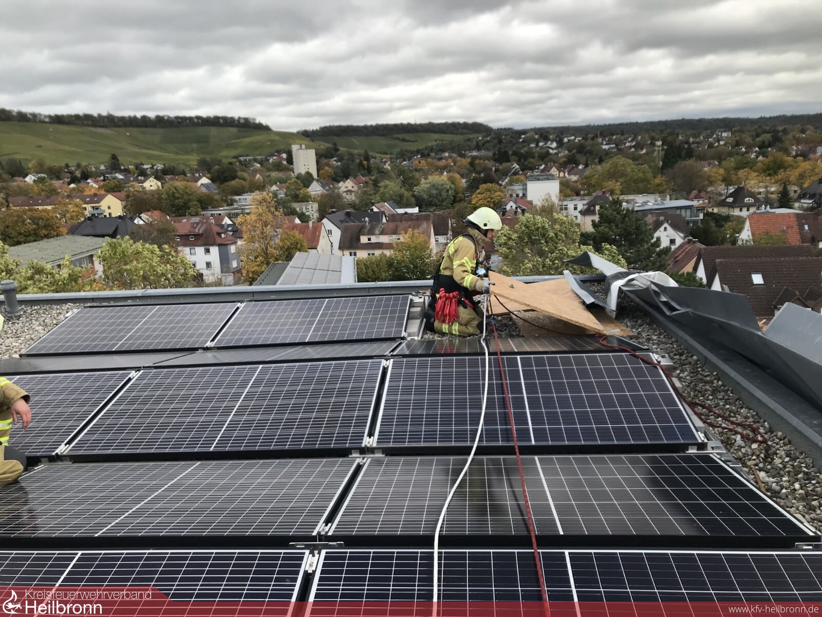 Bereits in den frühen Morgenstunden wütete das Sturmtief „Ignatz“ über der Region Heilbronn. Bis 15 Uhr mussten die Feuerwehr Heilbronn 18-mal ausrücken. Im Landkreis sorgte der Sturm für 8 Verkehrssicherungsmaßnahmen und sonstige 52 Einsätze durch starke Windböen. Eine orkanartige Böe erfasste ein Flachdach in der Stielerstraße und riss die Attika aus der Verankerung. Einzelne Holztafeln der Unterkonstruktion wurden durch den Wind davongetragen und beschädigten Nachbardächer sowie geparkte Fahrzeuge. Gegen Absturz gesicherte Einsatzkräfte der Feuerwehr entfernten die restlichen Tafeln und verschraubten das Blechdach wieder provisorisch auf dem Untergrund.