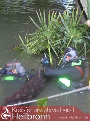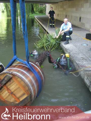 Taucher der Heilbronner Feuerwehr, welche sich zu einer Tauchübung in Klingenberg befanden, verlegten ihren Übungsort an die Friedrich-Ebert-Brücke.