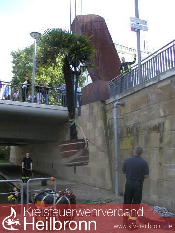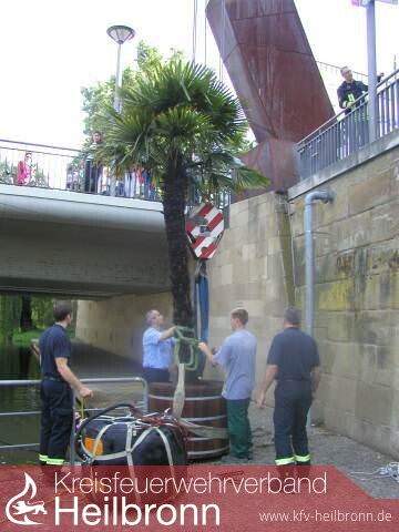 Ein Hebekissen am Holzkübel der Pflanze befestigt und mit Druckluft gefüllt, brachte die Palme an die Wasseroberfläche. So konnte sie an die Uferseite an der Oberen Neckarstraße gezogen werden.